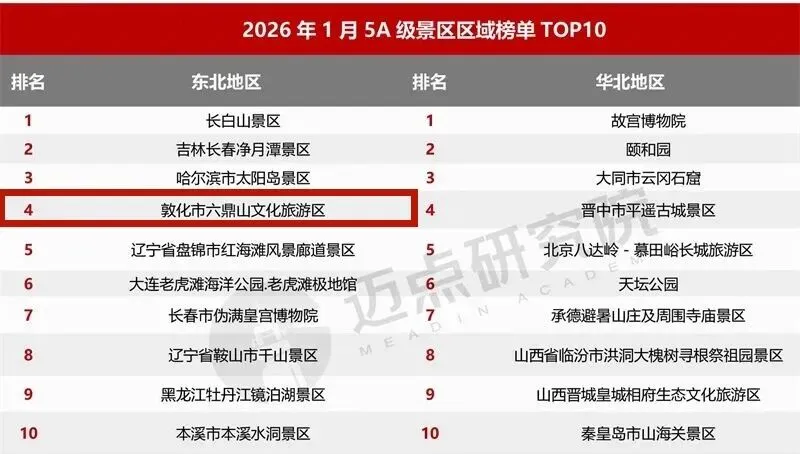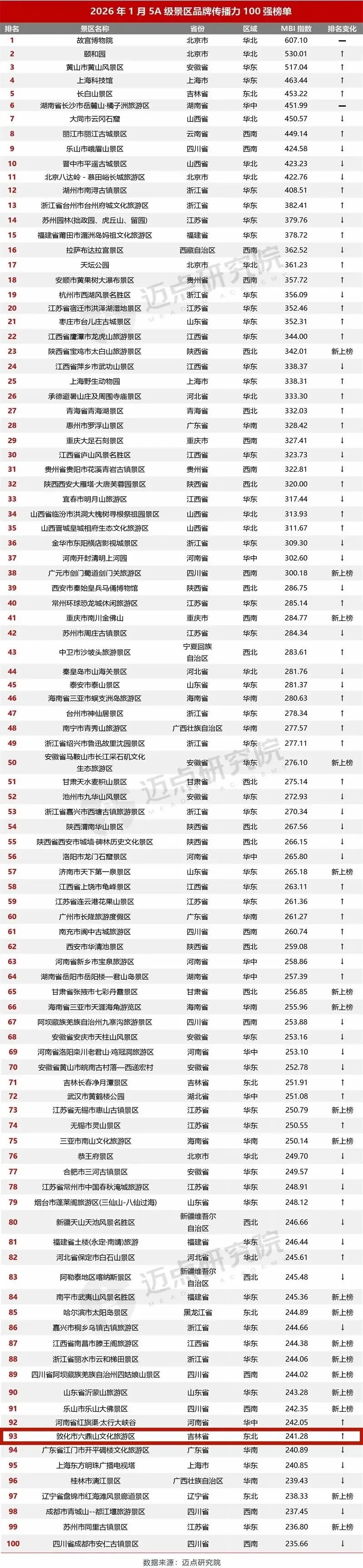 国内文旅行业权威数据分析机构 “迈点研究院”发布 2026年1月5A级景区品牌传播力100强榜单 吉林省敦化市六鼎山文化旅游区