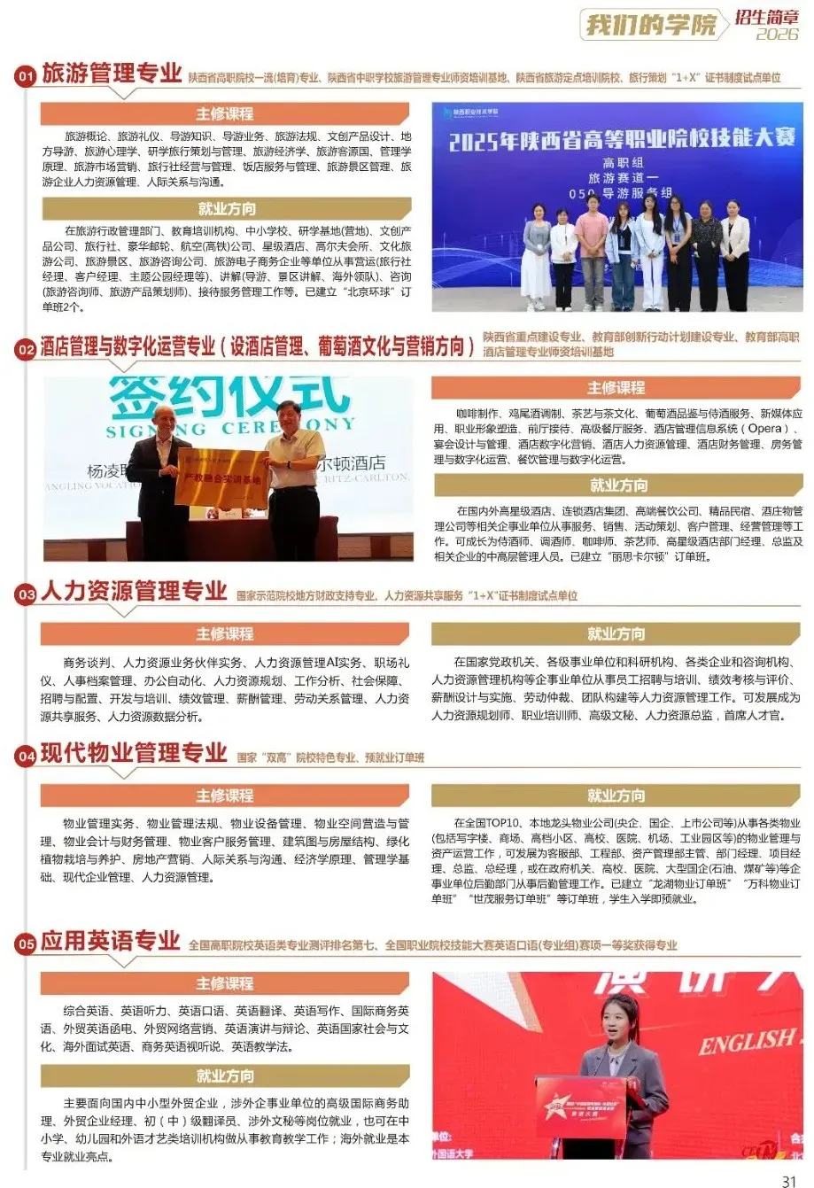 学院开设五个专业:旅游管理、酒店管理与数字化运营、现代物业管理、人力资源管理和应用英语。