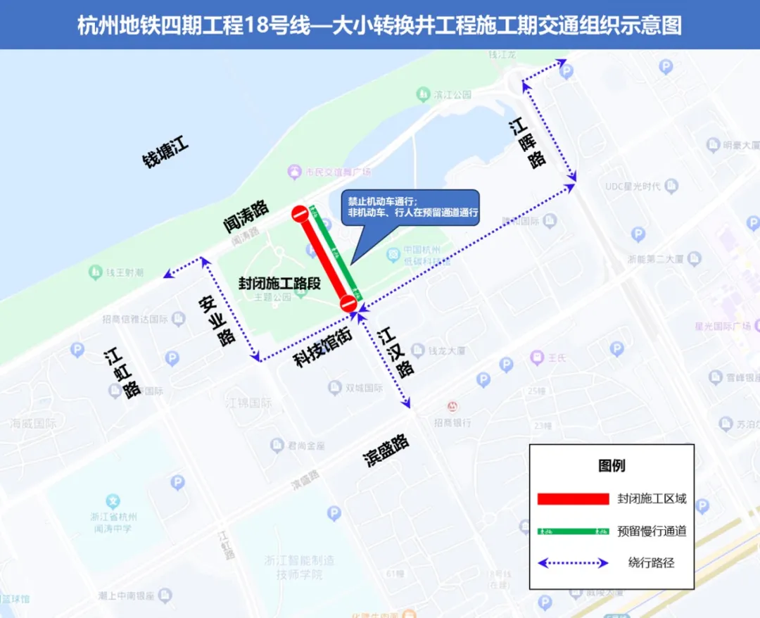 因杭州地铁四期工程18号线建设需要,2024年2月19日至2026年10月19日期间,杭州江汉路(闻涛路—科技馆街段)实施全封闭施工。