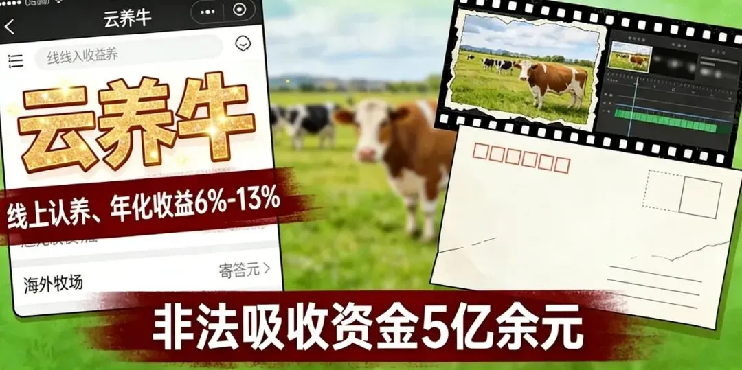 2024年5月,张某团伙搭建虚假“云养牛”平台,谎称拥有海外牧场,以“线上认养、年化收益6%-13%”为诱饵,通过寄送虚假宣传材料、伪造牧场视频等手段非法吸收资金5亿余元,9月,警方跨省收网抓获全部嫌疑人。
