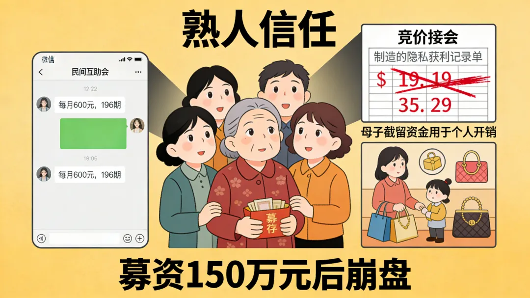2020-2022年,王某某、徐某某母子二人以“民间互助会”为名,制定“每月600元,196期”规则,通过微信群向43人募资150万元。初期以“竞价接会”制造“获利”假象,后期截留前4期资金用于个人开销,导致崩盘,参与者多为农村妇女,因“熟人信任”投入积蓄。2024年10月,抚州市临川区法院以非法吸收公众存款罪判处王某某、徐某某母子有期徒刑1年8个月。