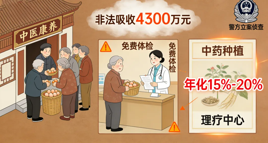 2024年3月,广州番禺警方对某中医馆立案侦查。该医馆以“中医康养”为名,通过免费体检、赠送鸡蛋吸引老年人,推销“中药种植”“理疗中心”项目,承诺年化15%-20%,非法吸收4300万元。资金用于支付业务员提成(30%)、场地租金(25%),仅5%用于药材采购。2024年12月,医馆人员陈某等3人被批捕,冻结资金800万元。