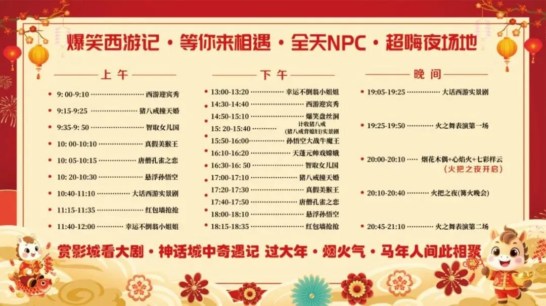 德影城塑造马年新春氛围,以“金马贺岁+西游演绎”为设计灵感,纹样与鎏金字相映成趣,园区内搭配上德影经典IP的新春布置氛围、联名灯笼,成为新春打卡新热点。园区内廊道设置“马年祈福钟” “红包互动墙”等暖心寄语,成为年轻人社交分享的“新春文案库”;推出限定演出早鸟票、游玩票等,定制各类马年文创消费产品。