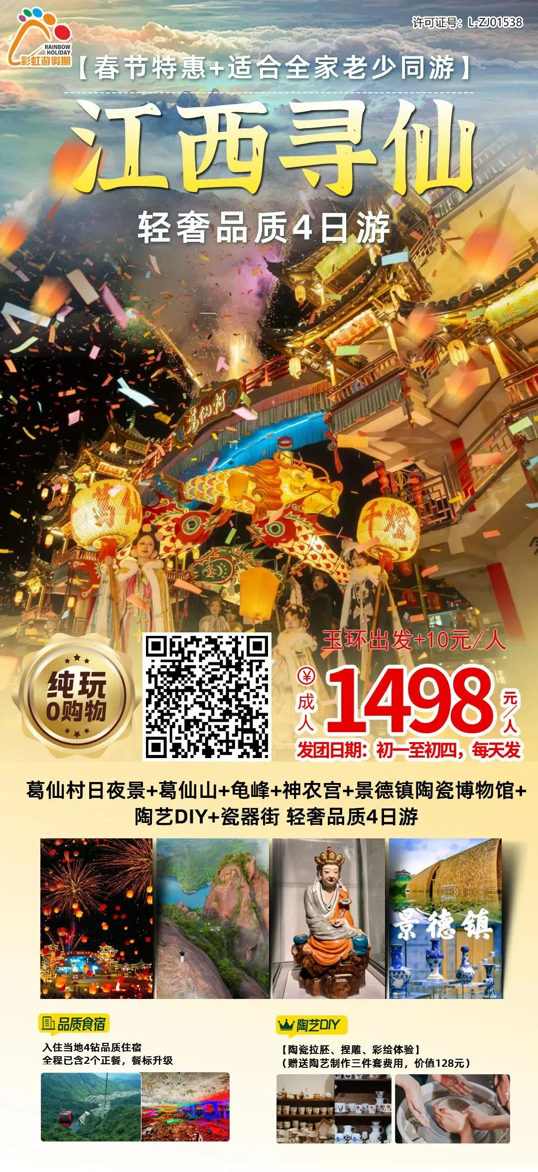 3.【春节特惠·江西寻仙+适合全家老少同游】 葛仙村日夜景+葛仙山+龟峰+神农宫+景德镇陶瓷博物馆+陶艺DIY+瓷器街 轻奢品质4日游
