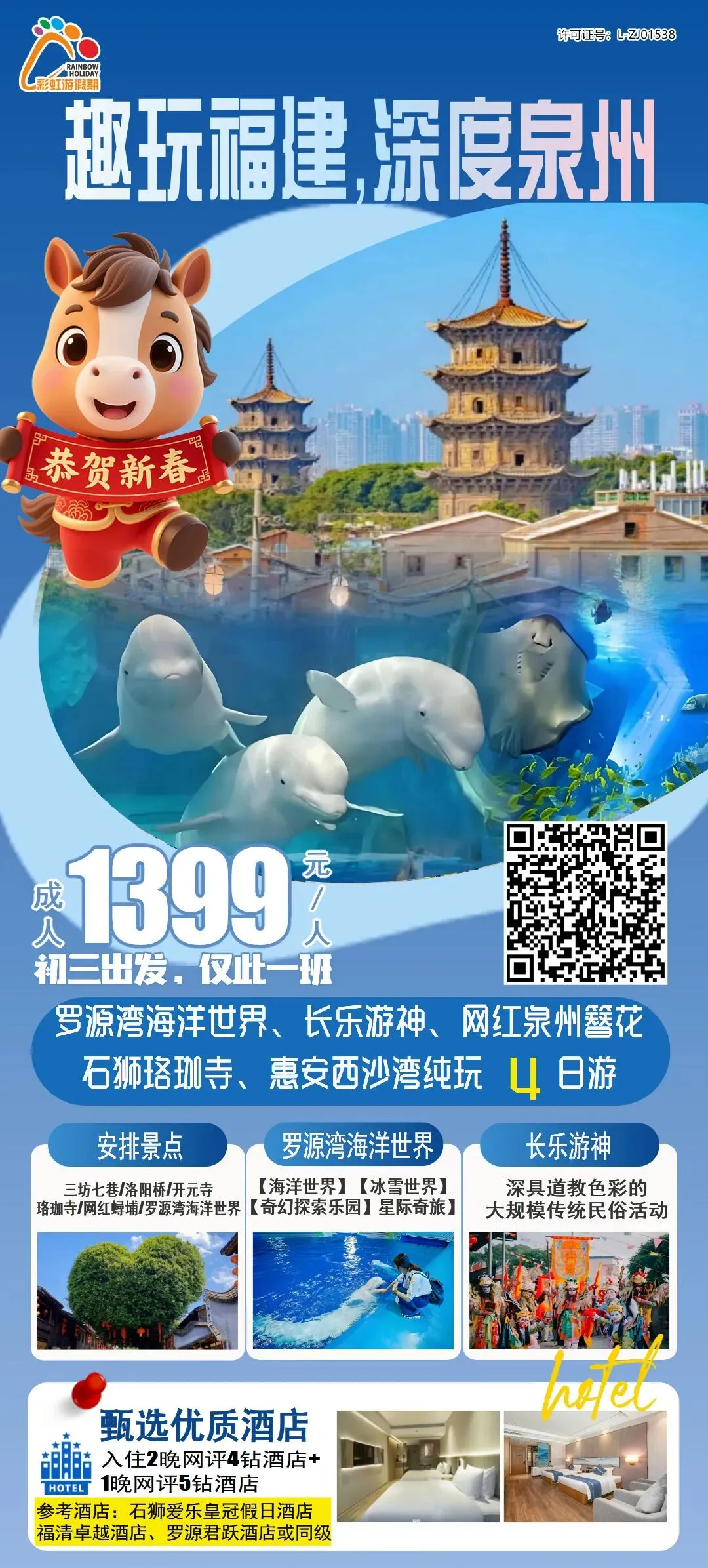 5.【趣玩福建,深度泉州】——福建罗源湾海洋世界、福建长乐游神活动、网红泉州簪花、石狮珞珈寺、惠安西沙湾纯玩4日游(入住2晚4钻酒店+1晚五钻酒店)