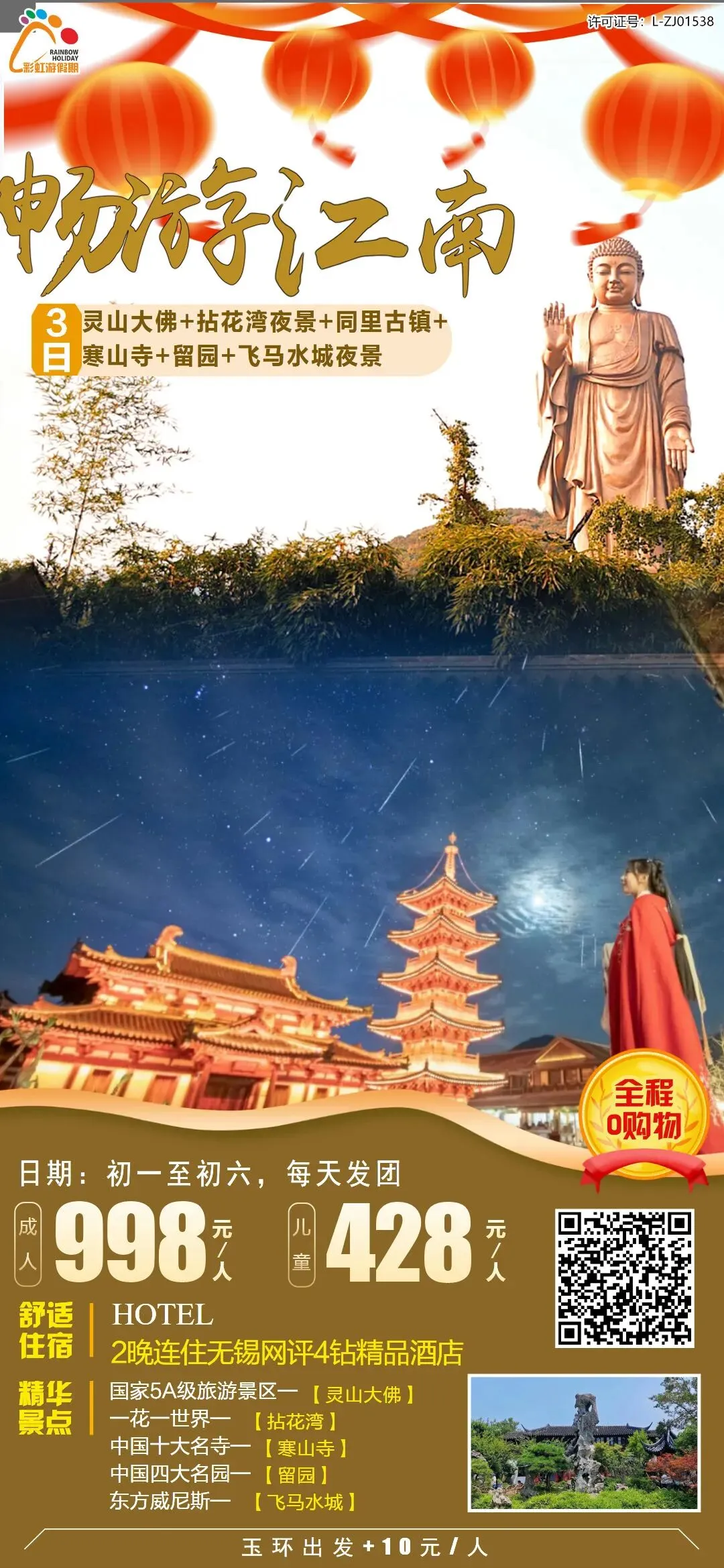3.【畅游江南、精品景区一网打尽】—— 无锡网红双夜景·古韵苏州精品纯玩3日游 (灵山大佛+拈花湾夜景+同里古镇+寒山寺+留园+飞马水城夜景)