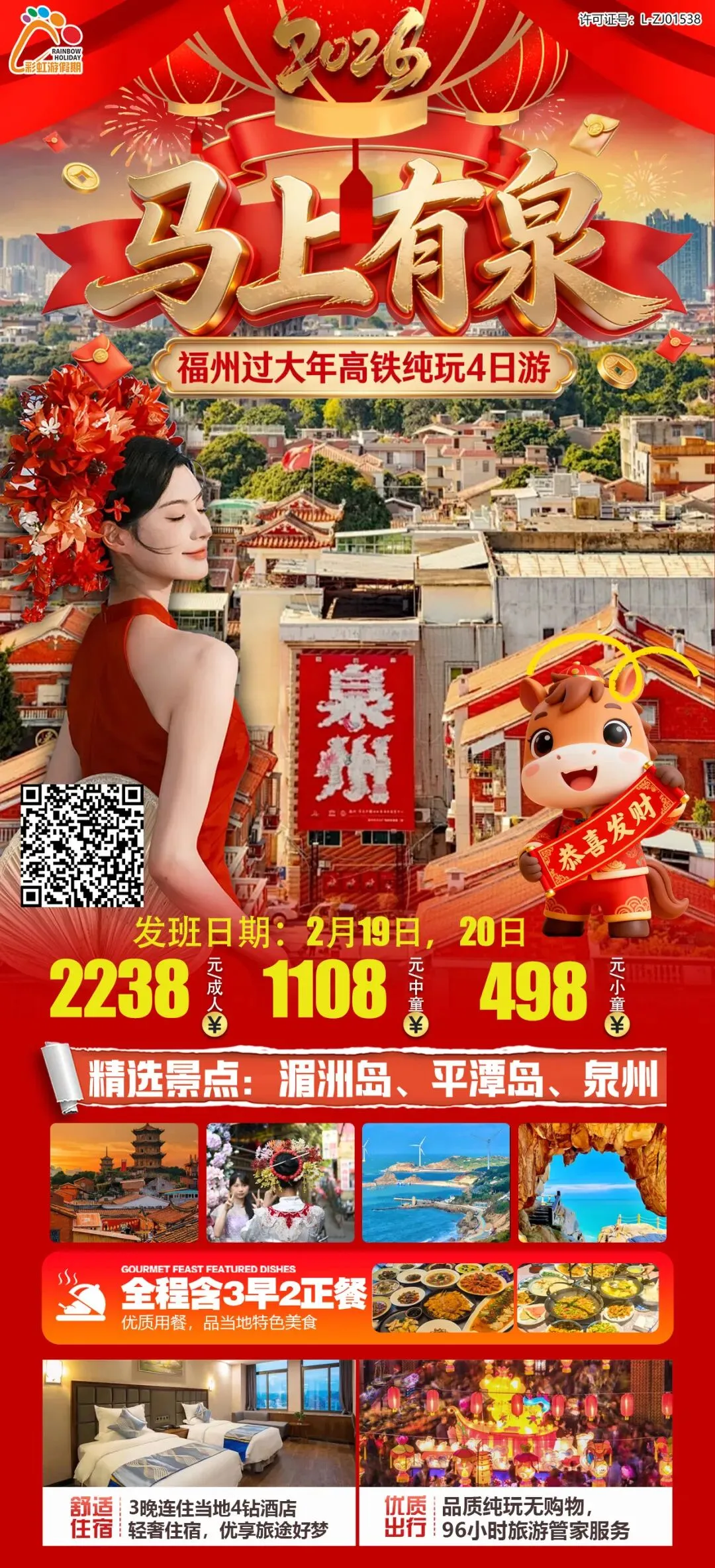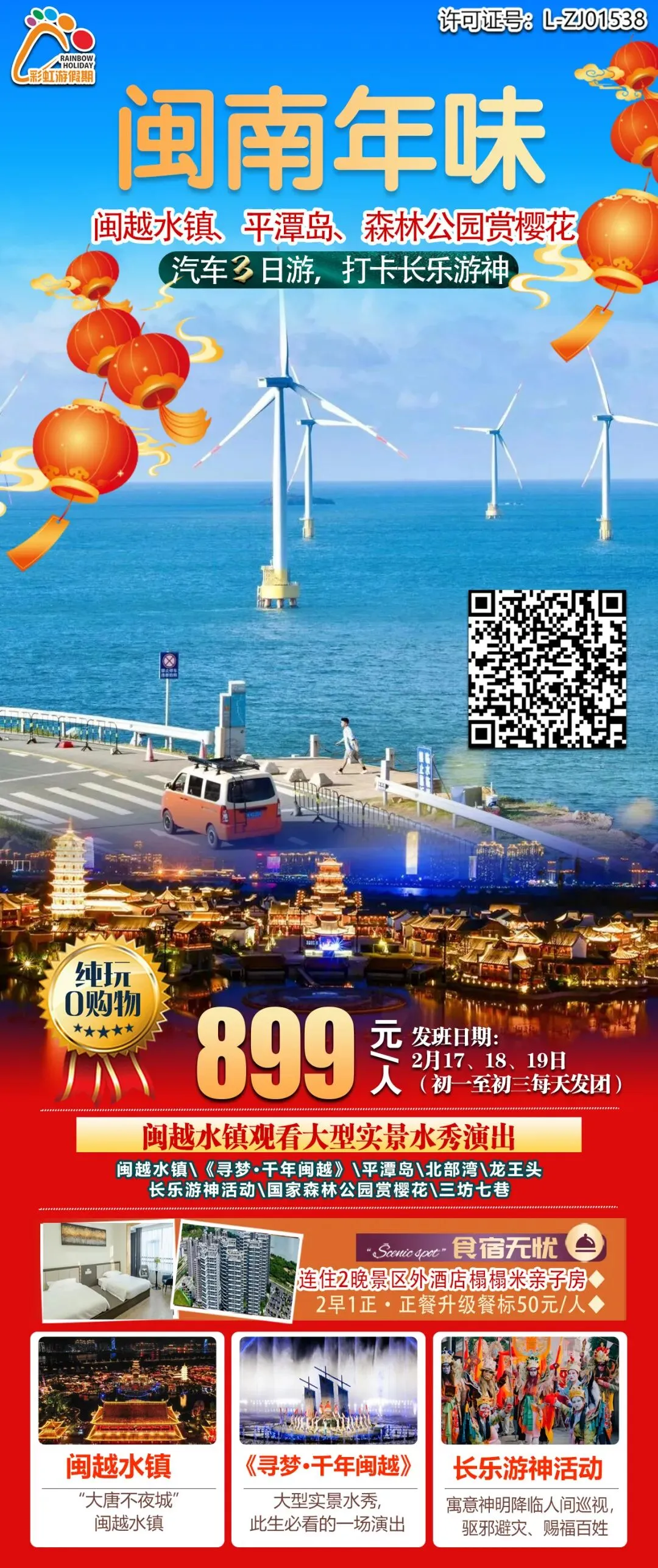 6.闽南过大年,游神、打铁花、烟花秀、看演出,统统安排……年廿九出发,1580元桌阖家年夜饭走起】——福州长乐游神活动、闽越水镇民俗体验(日景+夜景深度游览)+观看大型实景水秀演出(包含)、森林公园赏樱花、打卡平潭岛海岛风光、莆田妈祖行宫纯玩4日游(全程入住4钻酒店)