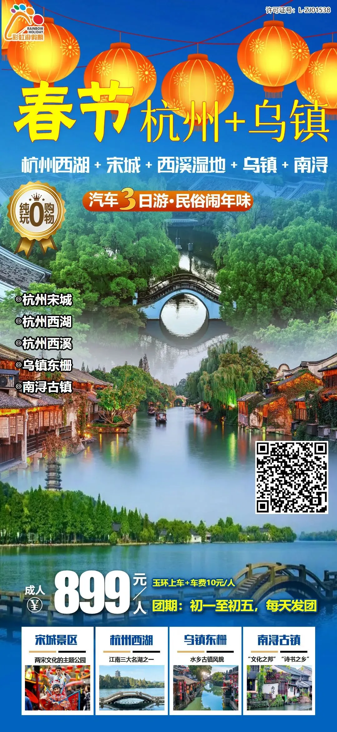 16.【春节杭州乌镇,民俗闹年味】 杭州深度游——杭州西湖+宋城+西溪湿地+乌镇+南浔休闲纯玩3日游