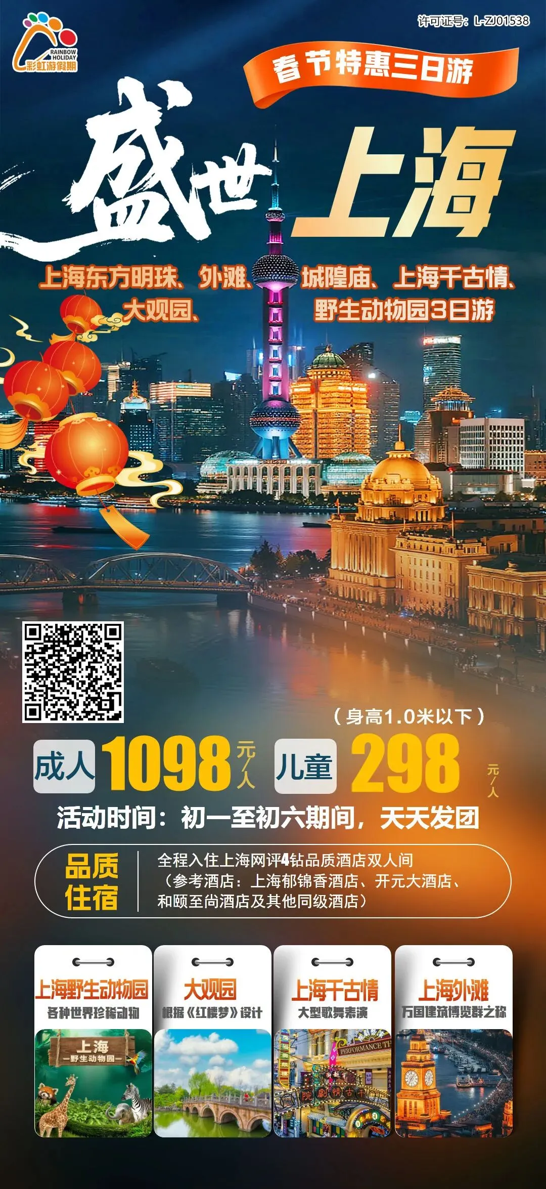 18.【盛世上海】 上海东方明珠、外滩、城隍庙、上海千古情、大观园、野生动物园特惠3日游