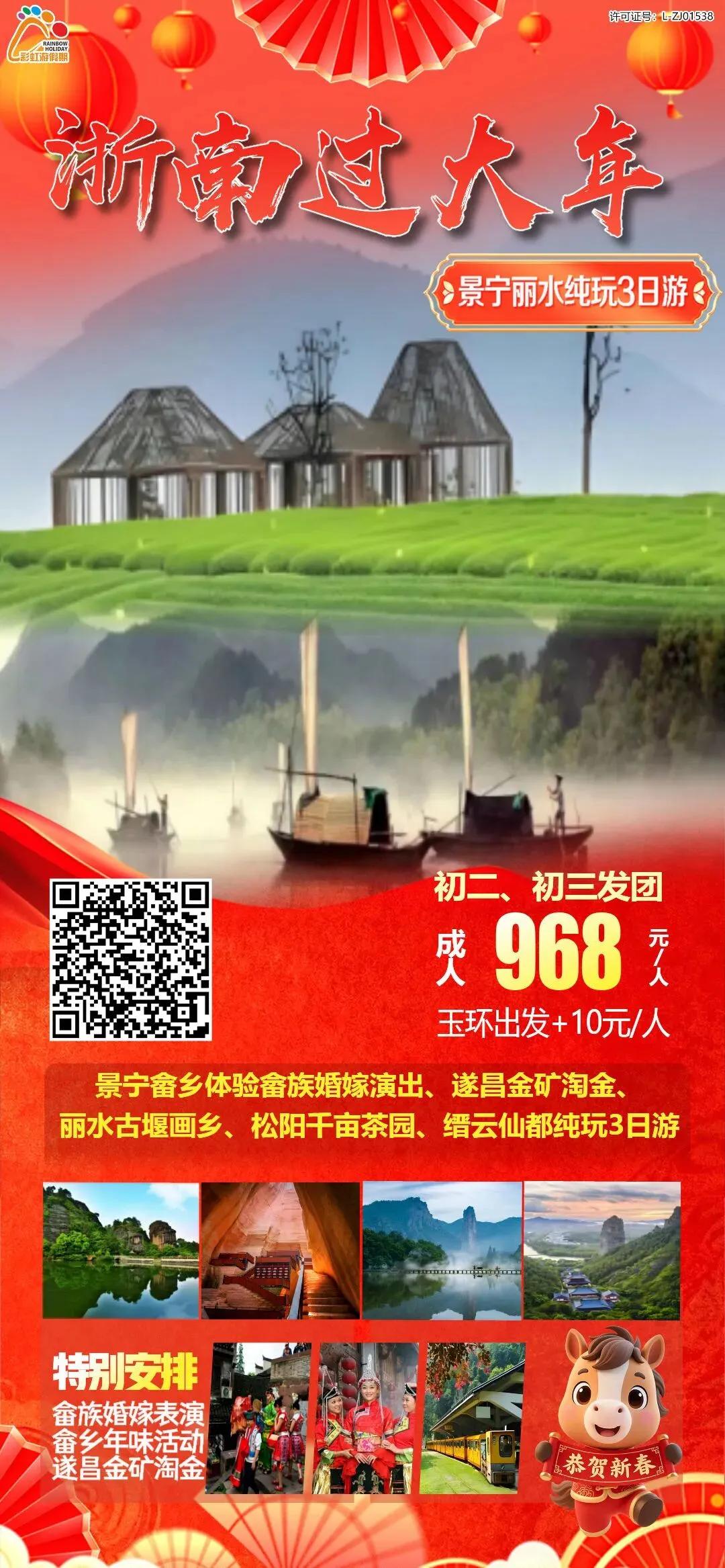19.【浙南过大年】——景宁畲乡体验畲族婚嫁演出、遂昌金矿淘金、丽水古堰画乡、松阳千亩茶园、缙云仙都纯玩3日游