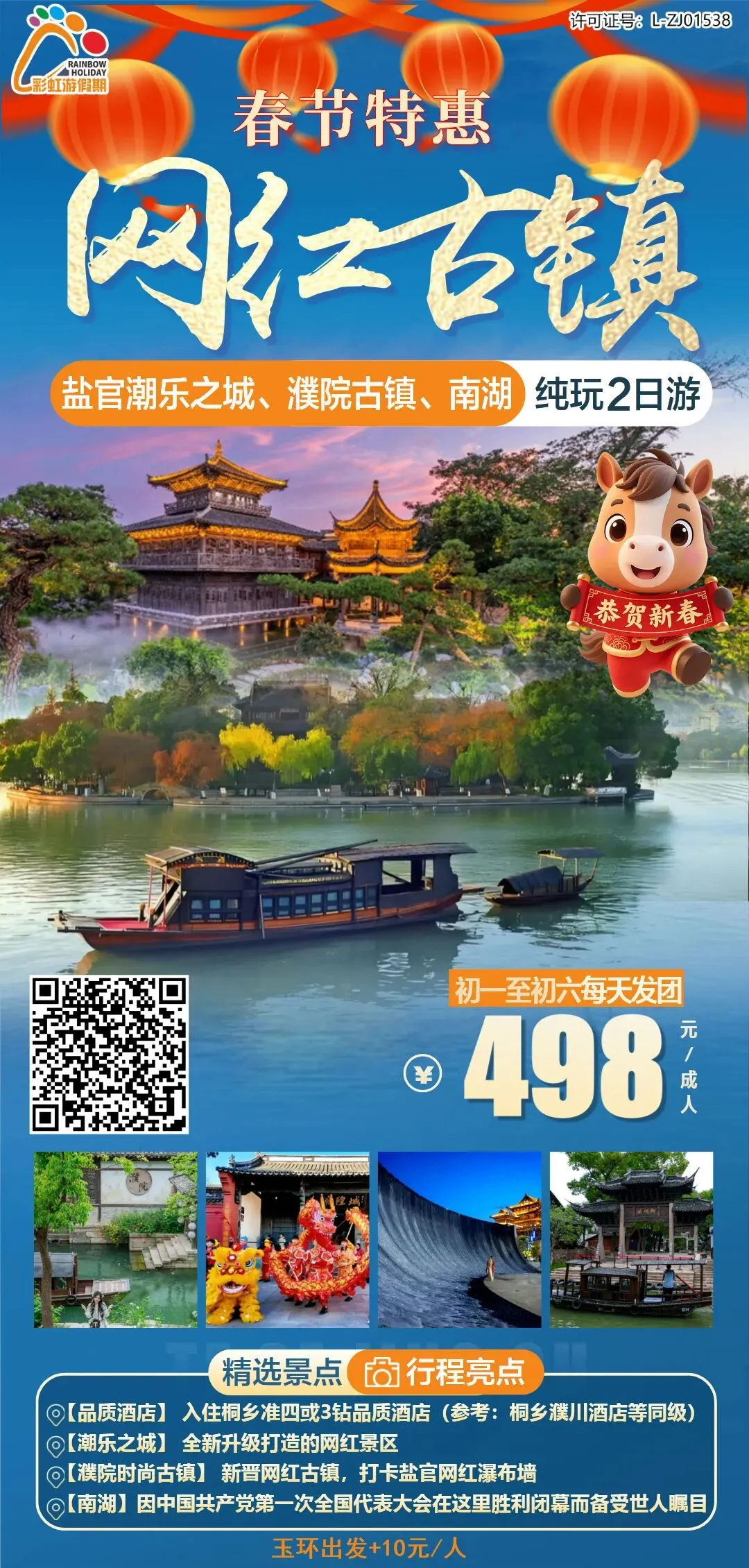 4.【春节特惠—畅玩新晋网红古镇·全家一起玩】 盐官潮乐之城、网红瀑布墙、濮院时尚古镇日夜景+鱼灯巡游、嘉兴南湖超值纯玩2日游