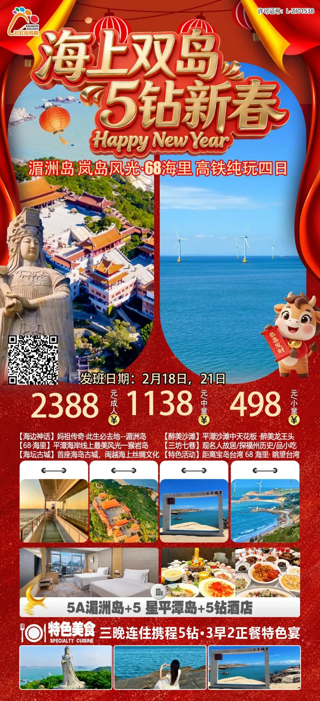 ---高铁游系列--- 1.【海上双岛·5钻新春】湄洲岛 岚岛风光·68海里 高铁纯玩四日