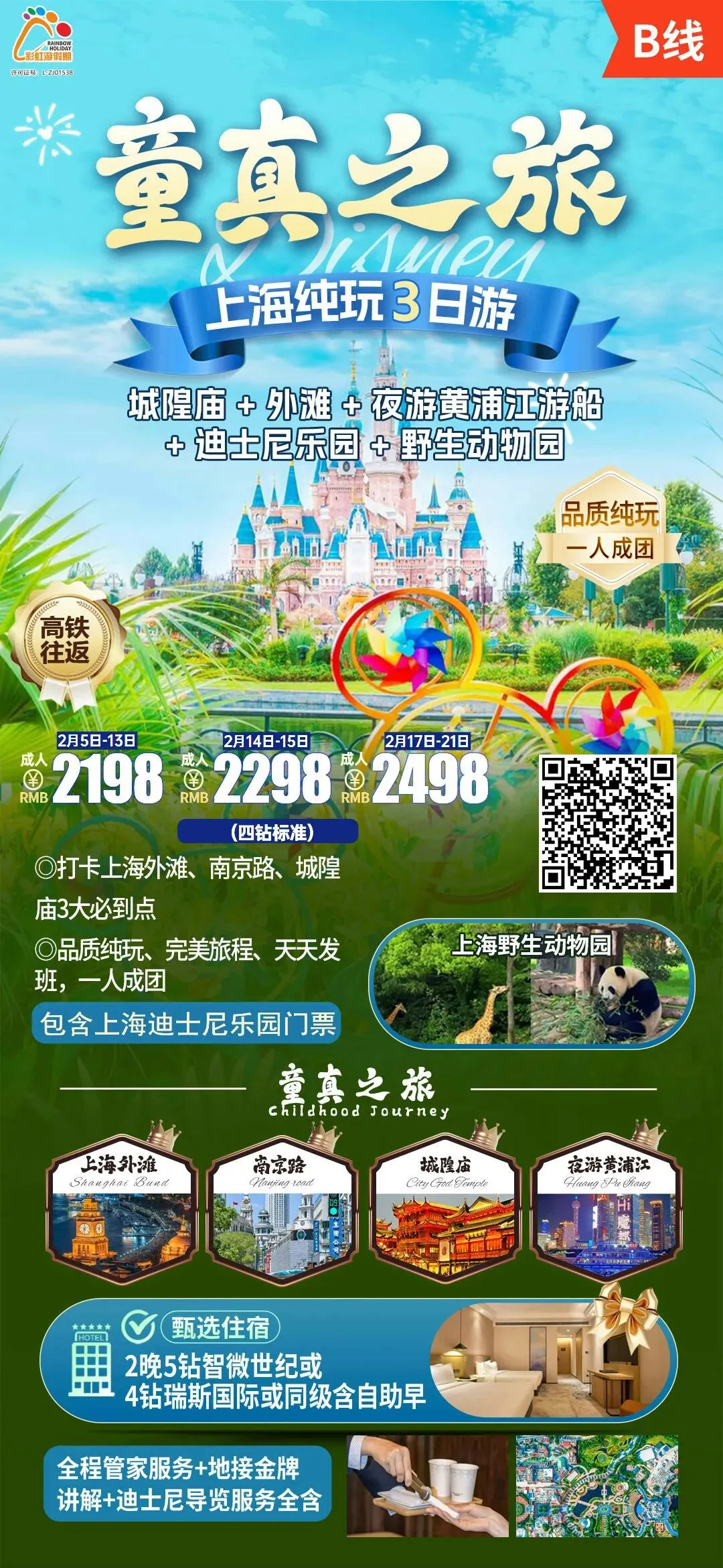 6.B线童真之旅【高铁往返·圆梦迪士尼·上海经典纯玩3日】 野生动物园&浦江游轮+打卡城隍庙+漫步南京路+外滩万国风情 上海迪士尼乐园--点亮心中奇梦