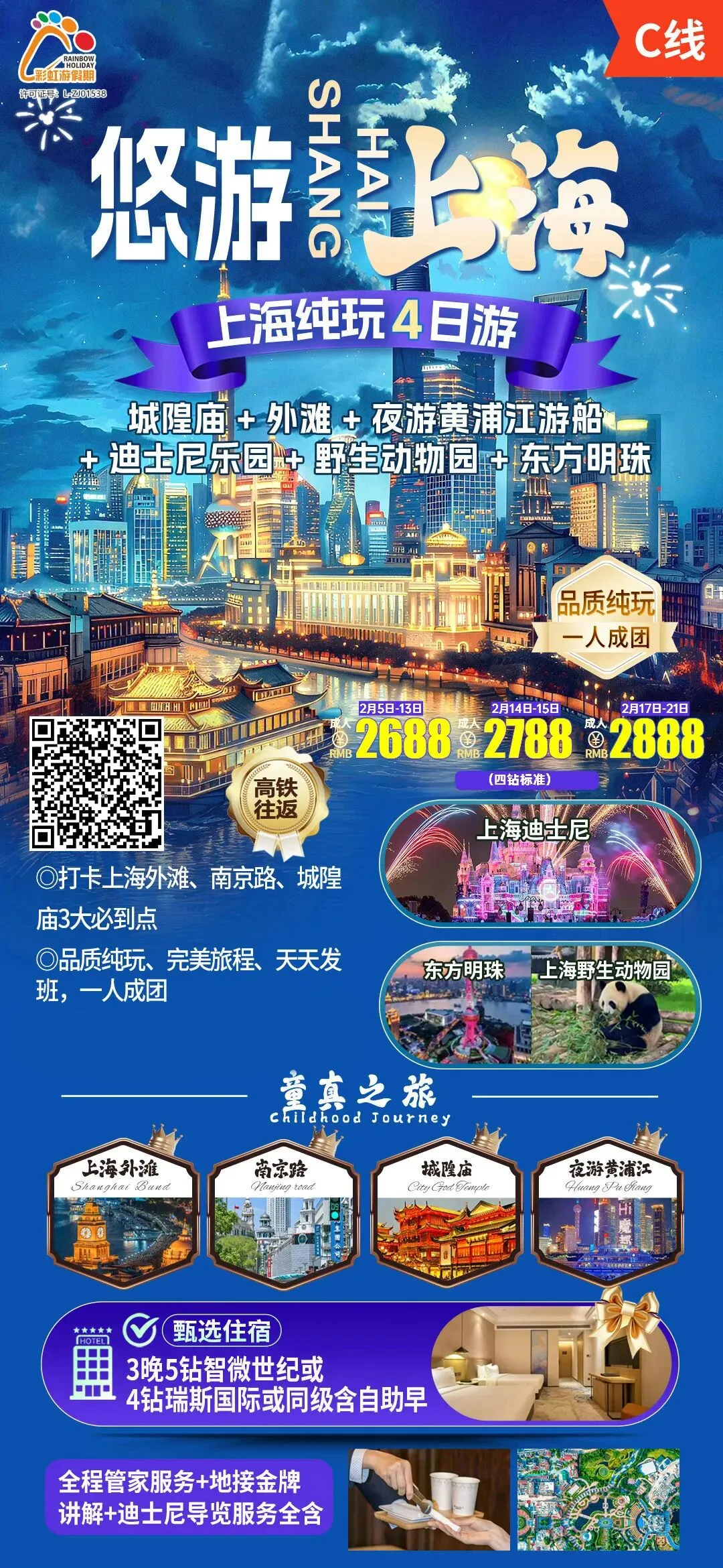 7.C线悠游上海【高铁往返·圆梦迪士尼·上海经典纯玩4日】上海东方明珠+野生动物园+浦江游轮+打卡城隍庙+漫步南京路+外滩万国风情 上海迪士尼乐园--点亮心中奇梦