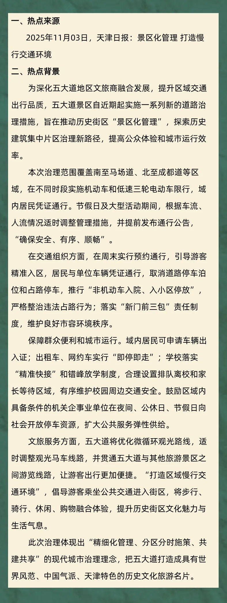 我认为,五大道推进景区化管理和慢行体系,是提升城市品质、传承文化风貌、改善生活体验的关键举措,值得积极肯定、稳妥推进。