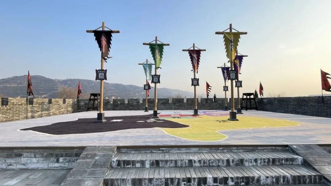 古城墙现已正式对外开放,昔日断壁残垣变身雄关屏障。修复后的城墙不仅成功串联起太初宫与关楼两大核心景观,更形成了一条贯穿古今的完整游览动线。古城墙沿途还设有以“战国七雄”为主题的互动展示区,各国旗帜与疆域图清晰呈现。每面旗帜均附有二维码,游客扫码即可获取该国的历史介绍、人物故事及相关成语典故,让风云激荡的战国历史在行走间触手可及。