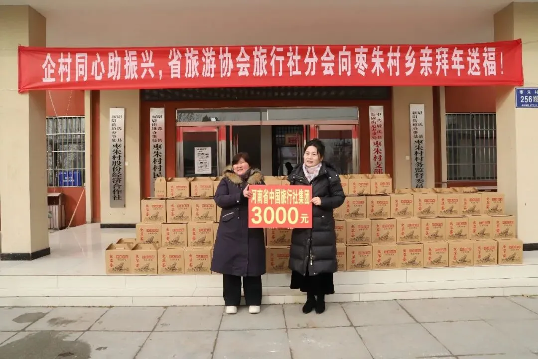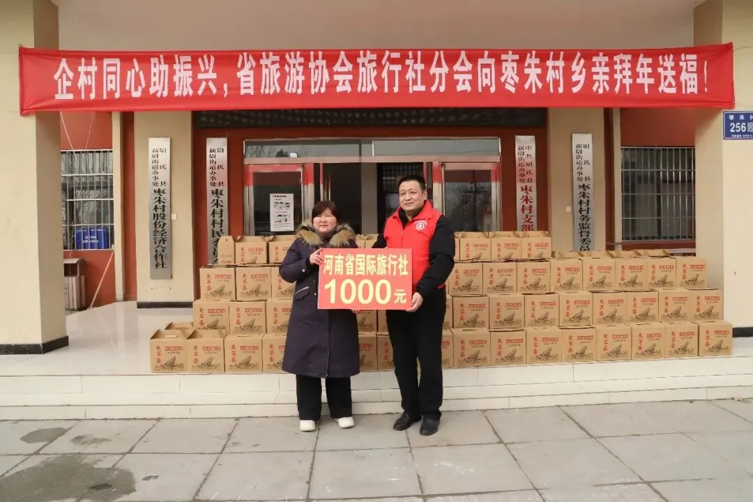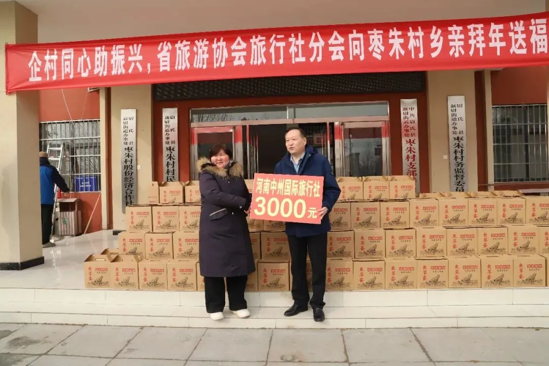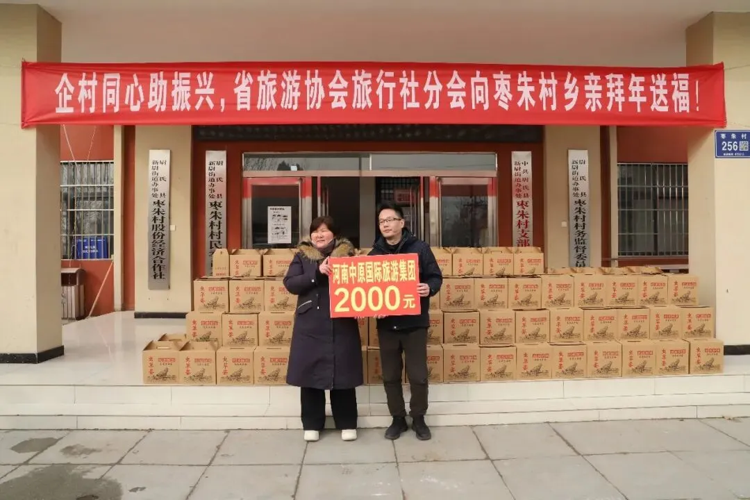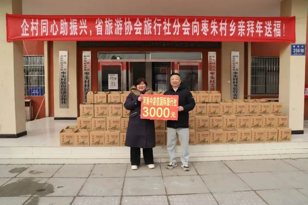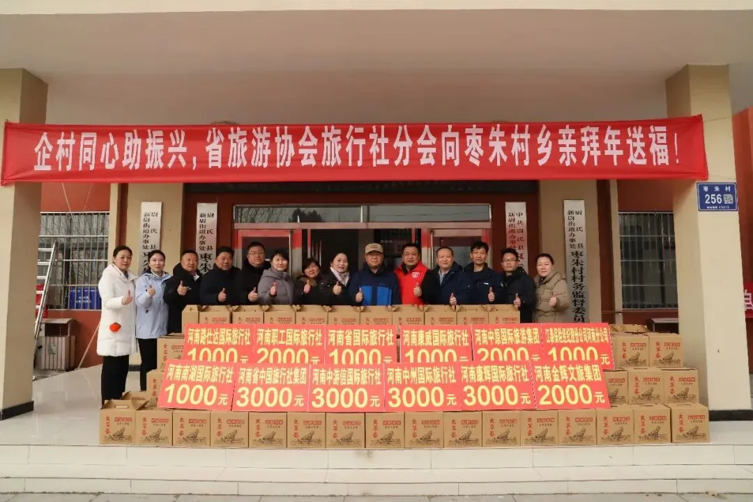 新春将至,暖意在心;岁序更替,情系乡邻。2月10日,省旅游协会旅行社分会组织河南省中国旅行社、河南中游信国际旅行社、河南康辉国际旅行社、河南中州国际旅行社、河南职工国际旅行社、河南中原国际旅游集团、河南金辉文旅集团、河南省国际旅行社、河南南湖国际旅行社、河南康威国际旅行社、河南路仕达国际旅行社、江泰保险经纪股份公司河南分公司等12家会员单位赴尉氏县枣朱村开展“情暖乡村、关爱同行”新春慰问活动,将价值2.3万元的爱心物资与真挚祝福送到枣朱村村民手中,以文旅行业的责任担当为乡村振兴注入温情力量,让这个春节更添暖意。