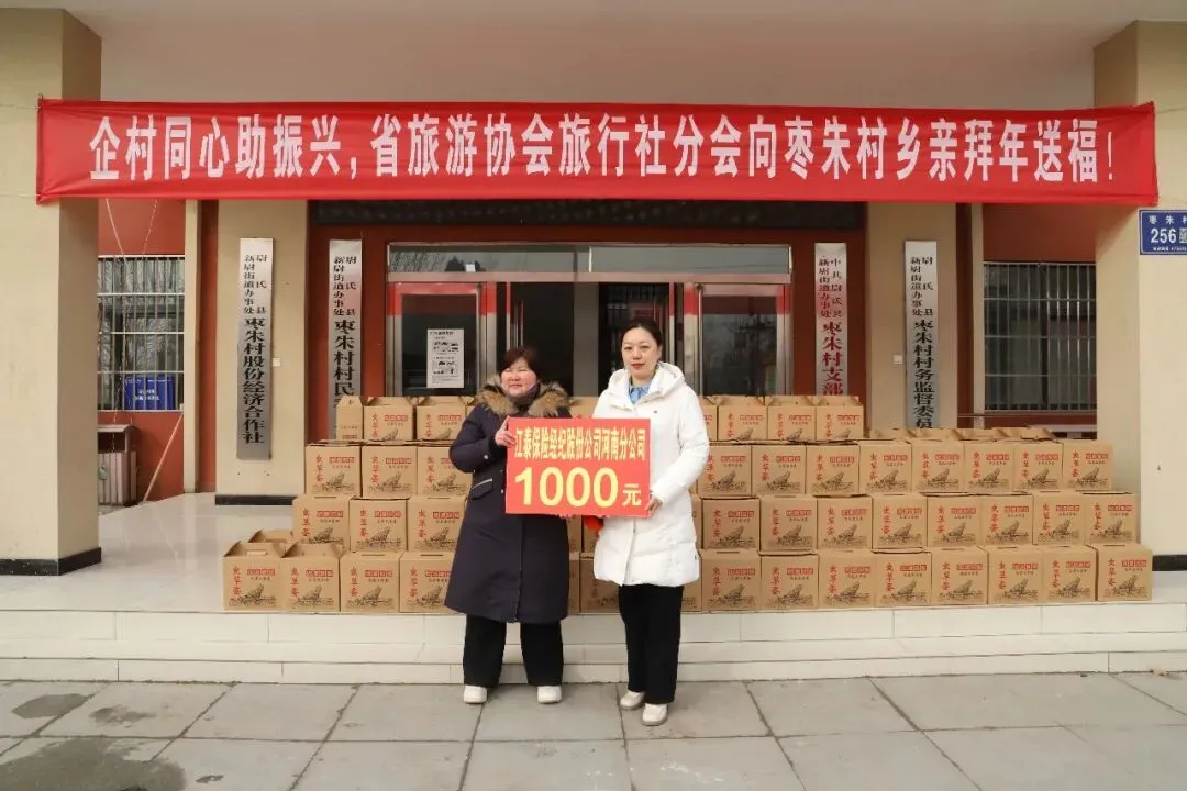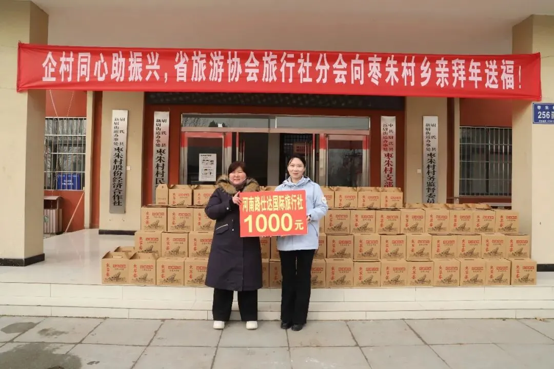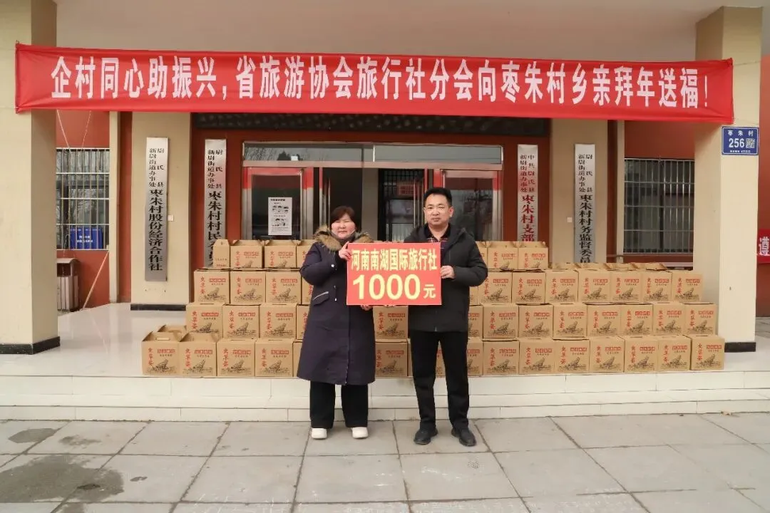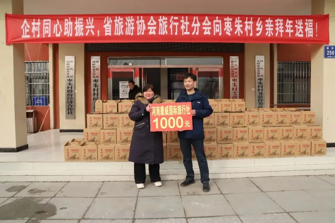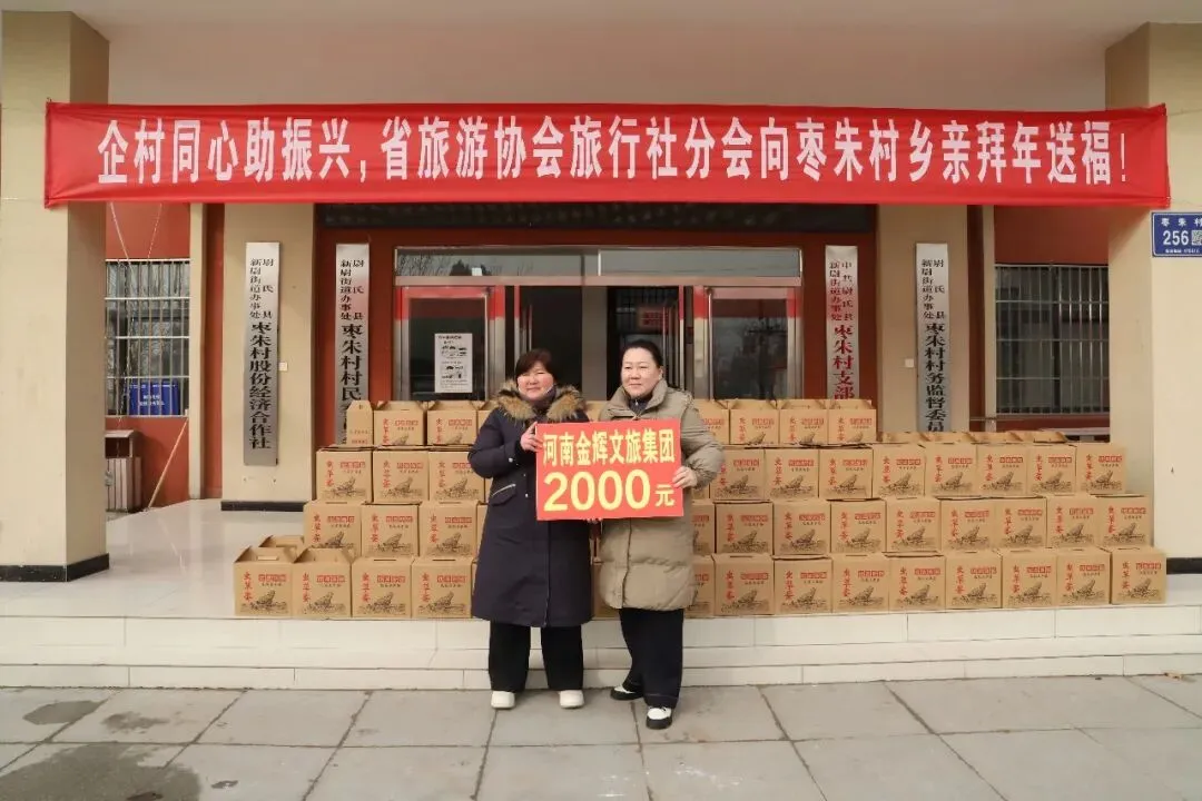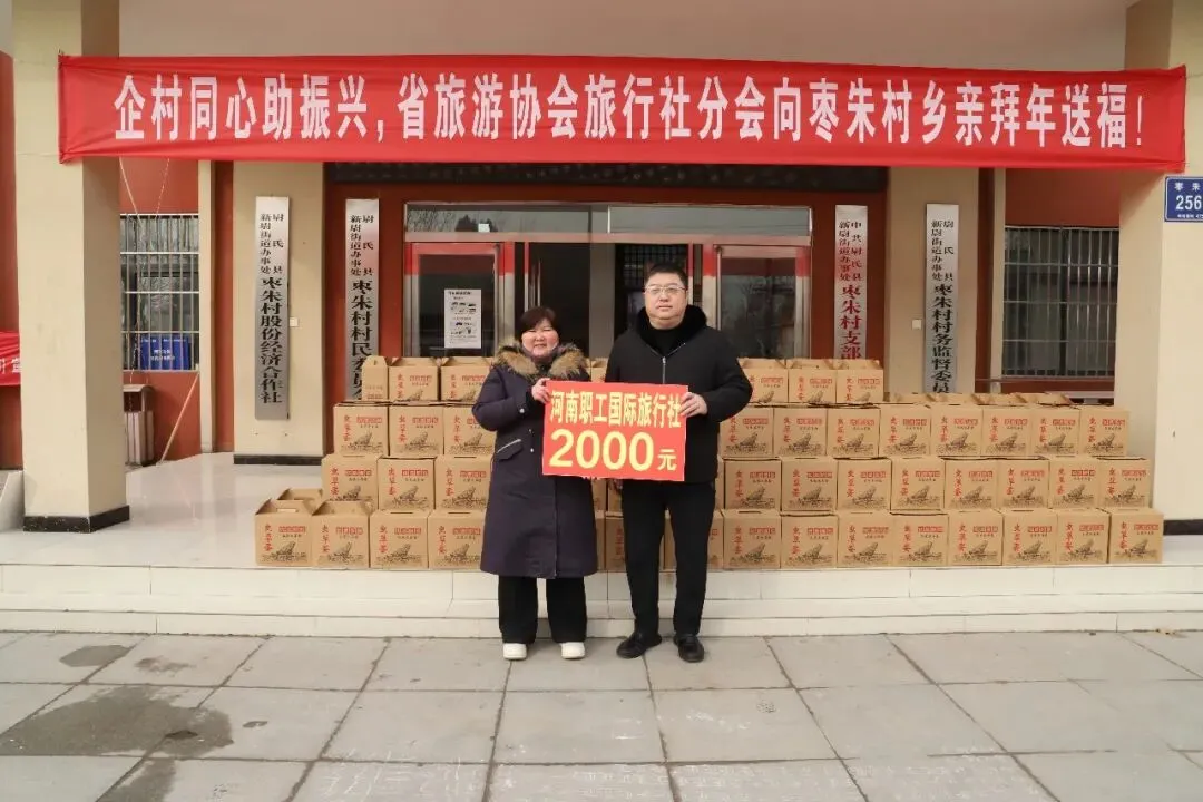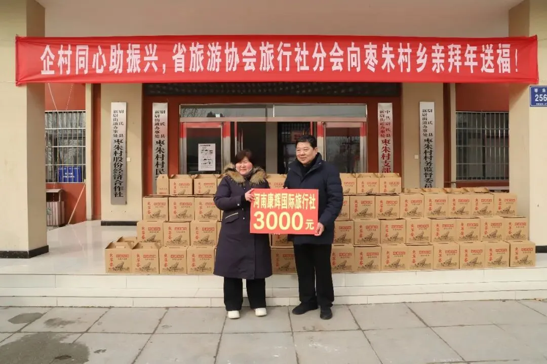新春将至,暖意在心;岁序更替,情系乡邻。2月10日,省旅游协会旅行社分会组织河南省中国旅行社、河南中游信国际旅行社、河南康辉国际旅行社、河南中州国际旅行社、河南职工国际旅行社、河南中原国际旅游集团、河南金辉文旅集团、河南省国际旅行社、河南南湖国际旅行社、河南康威国际旅行社、河南路仕达国际旅行社、江泰保险经纪股份公司河南分公司等12家会员单位赴尉氏县枣朱村开展“情暖乡村、关爱同行”新春慰问活动,将价值2.3万元的爱心物资与真挚祝福送到枣朱村村民手中,以文旅行业的责任担当为乡村振兴注入温情力量,让这个春节更添暖意。