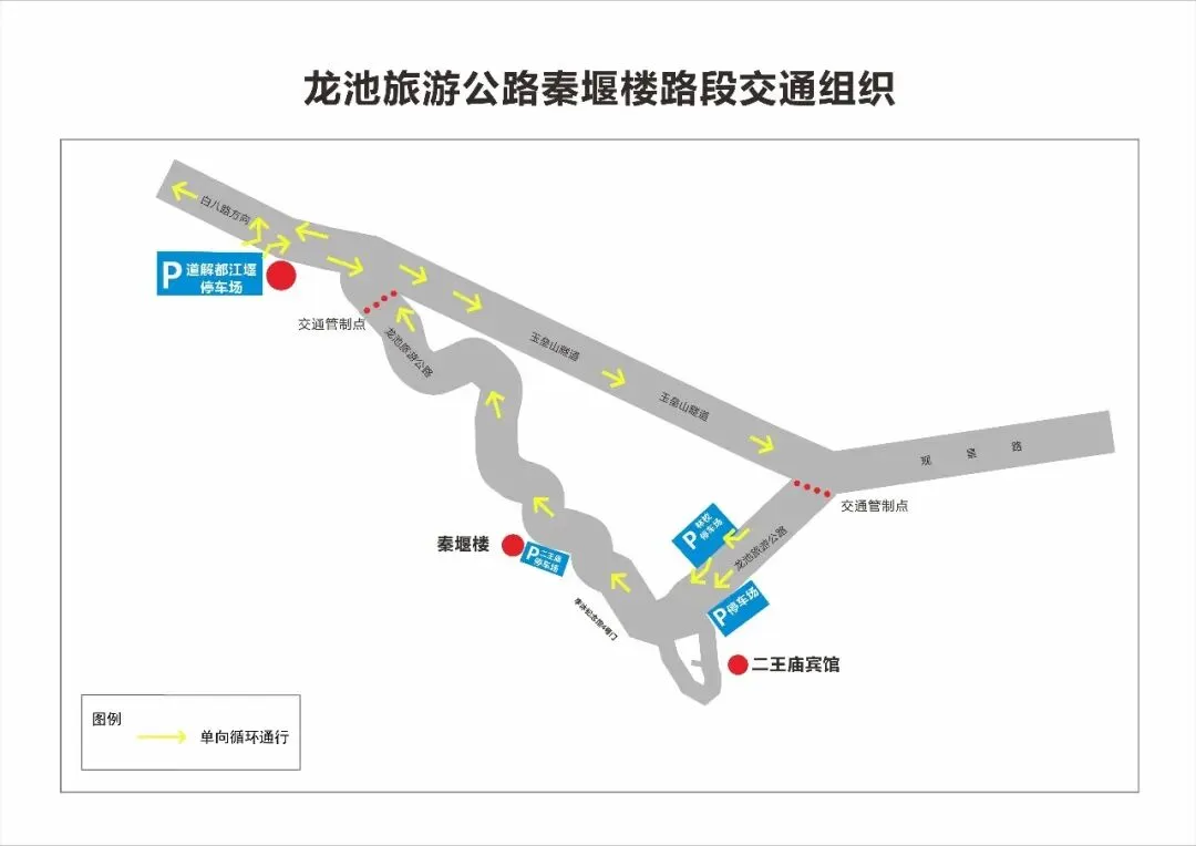 全线禁止机动车长时间停放,游客上下车后即刻驶离;前往秦堰楼的游客车辆请统一停放在道解都江堰停车场。