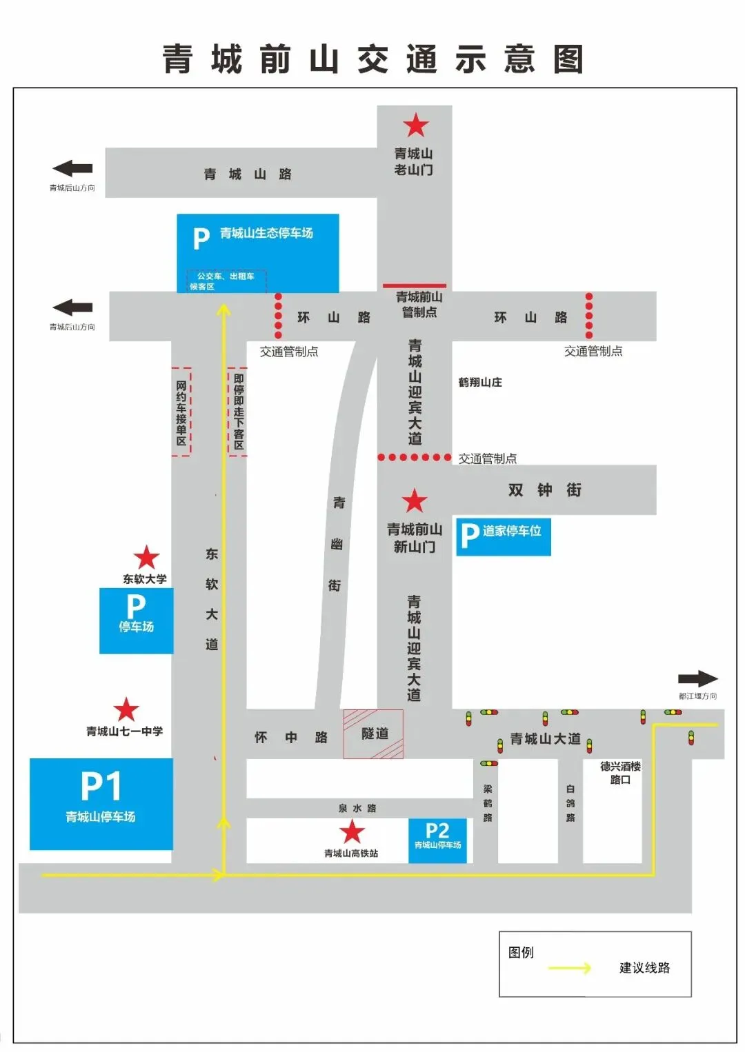 节日期间,公安交管部门将根据车流量实际情况适时对迎宾大道鹤翔山庄、环山路生态停车场及青幽街路段实行交通管制。在交通管制期间,旅游大巴及游客车辆请经青城山大道——S401(新106线)一一东软大道,前往青城山。