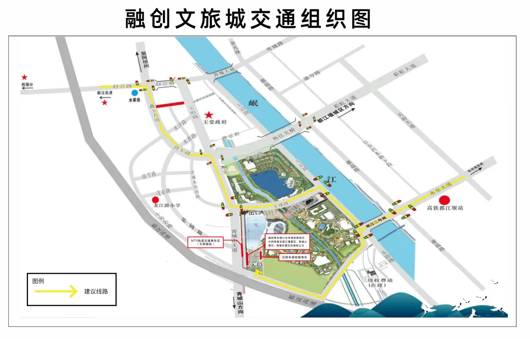 节日期间,都江堰景区和灌县古城由于车流量大,通行缓慢,建议将车辆停放至融创停车楼,免费换乘摆渡车或MTR前往都江堰景区和灌县古城,摆渡时间:停车楼至都江堰景区9:00-18:00;返回停车场23:00止。