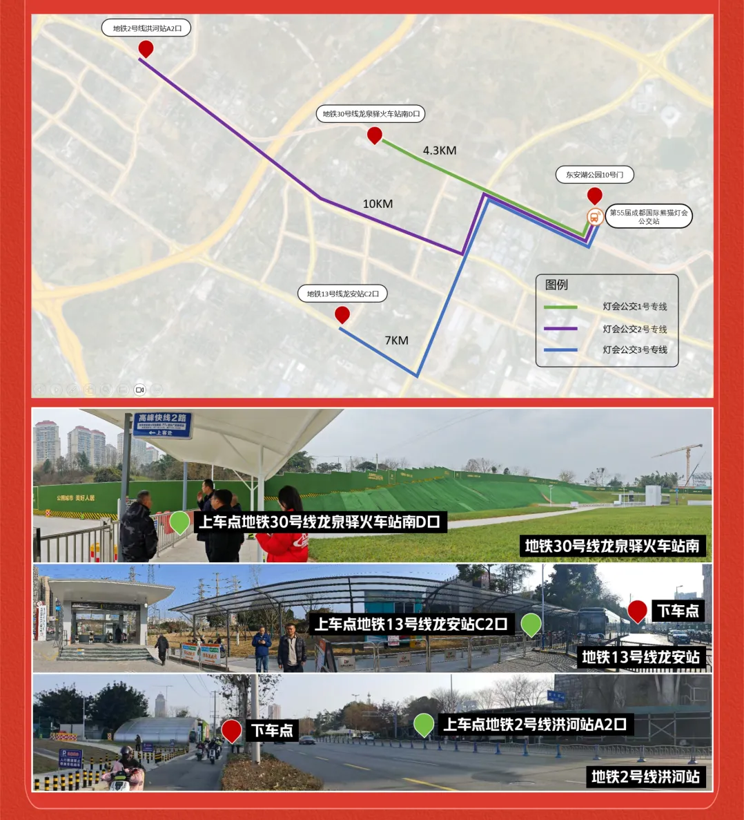 地铁30号线龙泉驿火车站南站、2号线洪河站、13号线龙安站,出站即可换乘灯会专属接驳车,直达园区入口,省心又便捷。