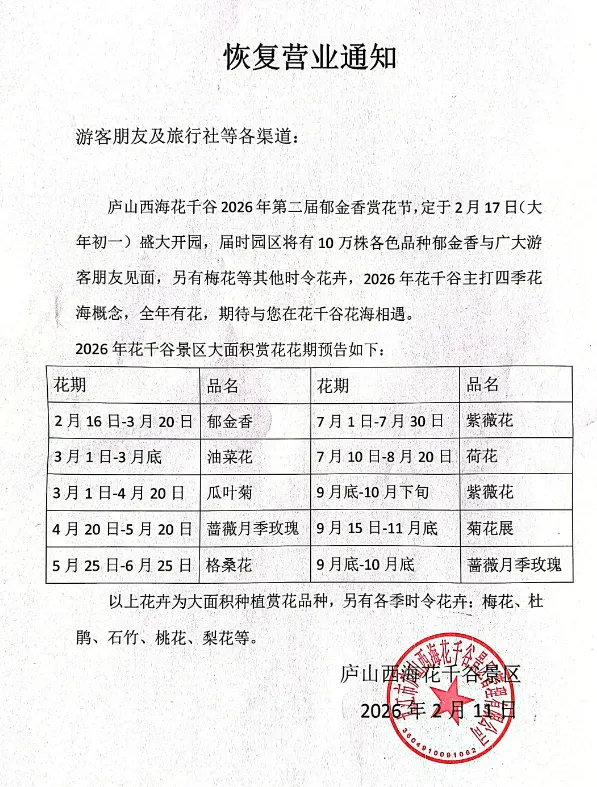 【景区通知】庐山西海花千谷于2月17日起恢复开园!请相互转告!