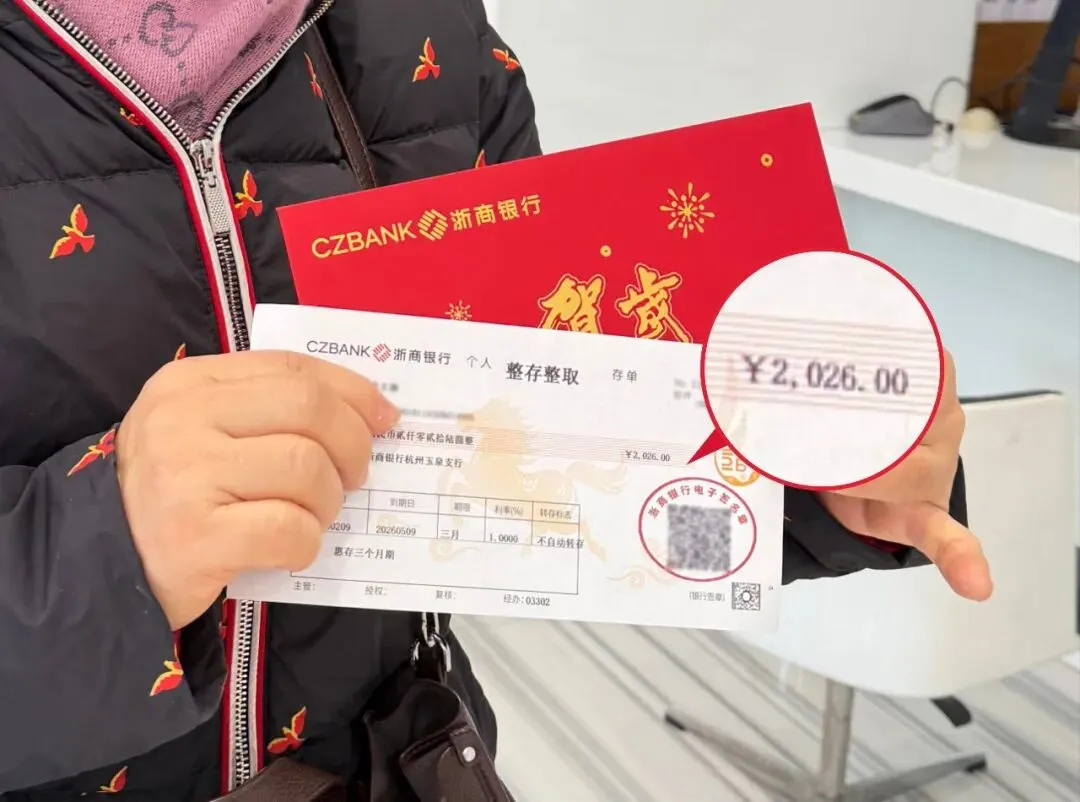 ▲近日,杭州一位女士开立了三张金额为2026元的浙商银行马年生肖存单,作为给三名孙辈的本命年压岁钱。