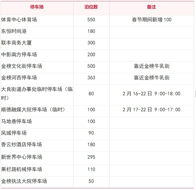 4、沿江路顺德融媒有限公司大院停车场2月17日-22日9:00-17:00开放,请务必在17:00前驶离车辆。