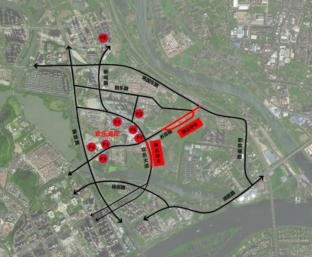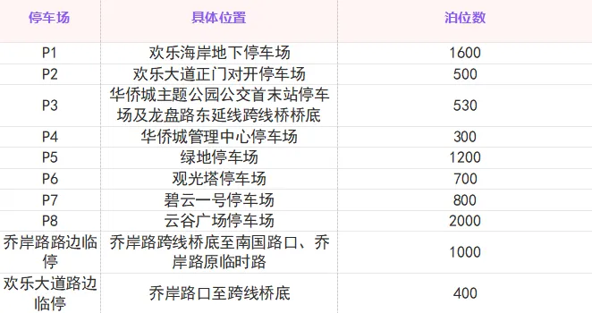 预计假期高峰时段,华侨城周边P1-P7停车场停车供应不足,停车排队预计会导致欢乐大道、乔岸路及碧桂路辅道拥堵,为避免排队停车加剧拥堵,建议游客高峰时段优先选择停车至外围P8停车场。