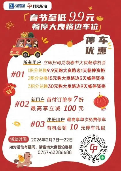详情点击链接了解:《春节停车自由!9.9元起承包全天停车,大良路内车位任停!》