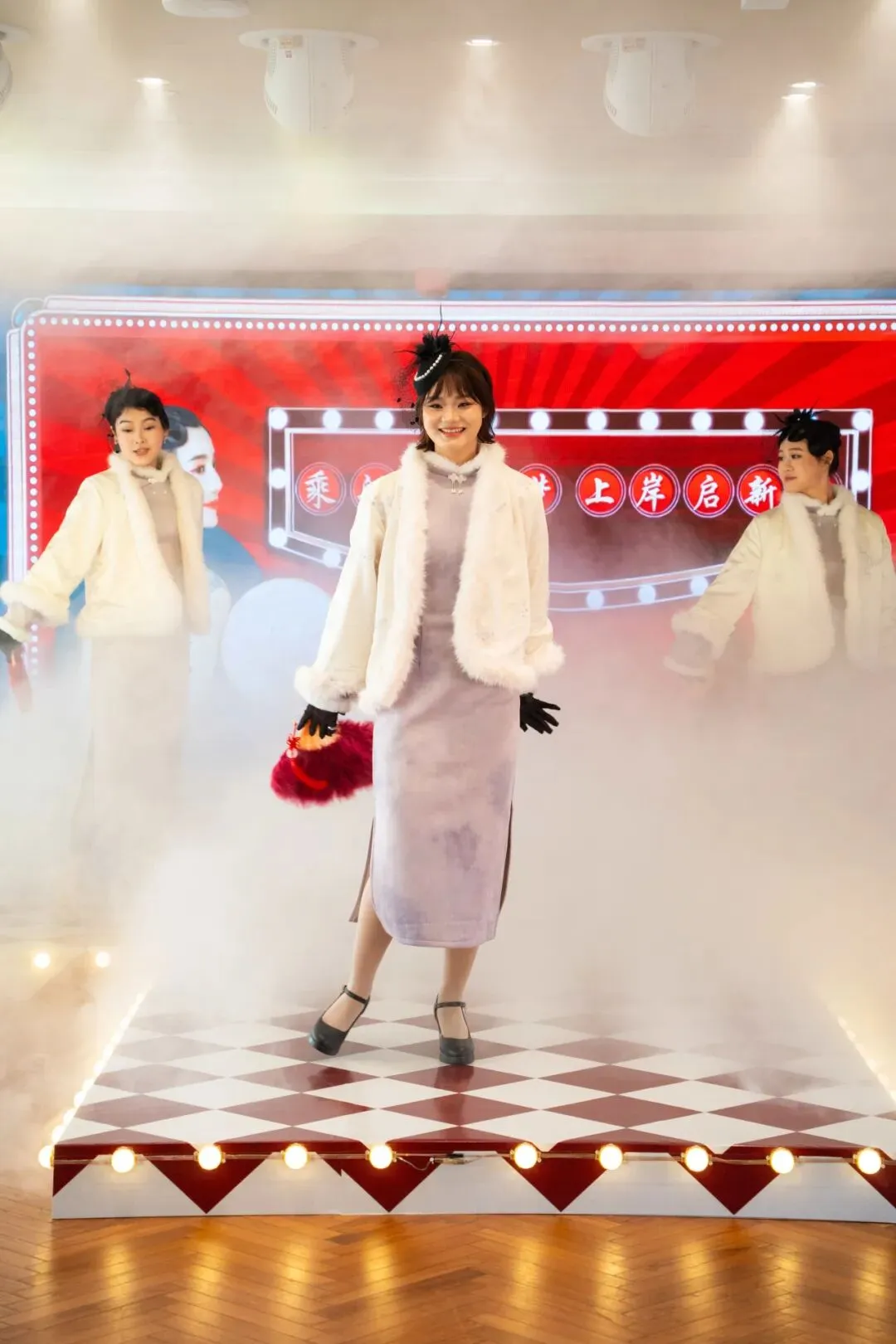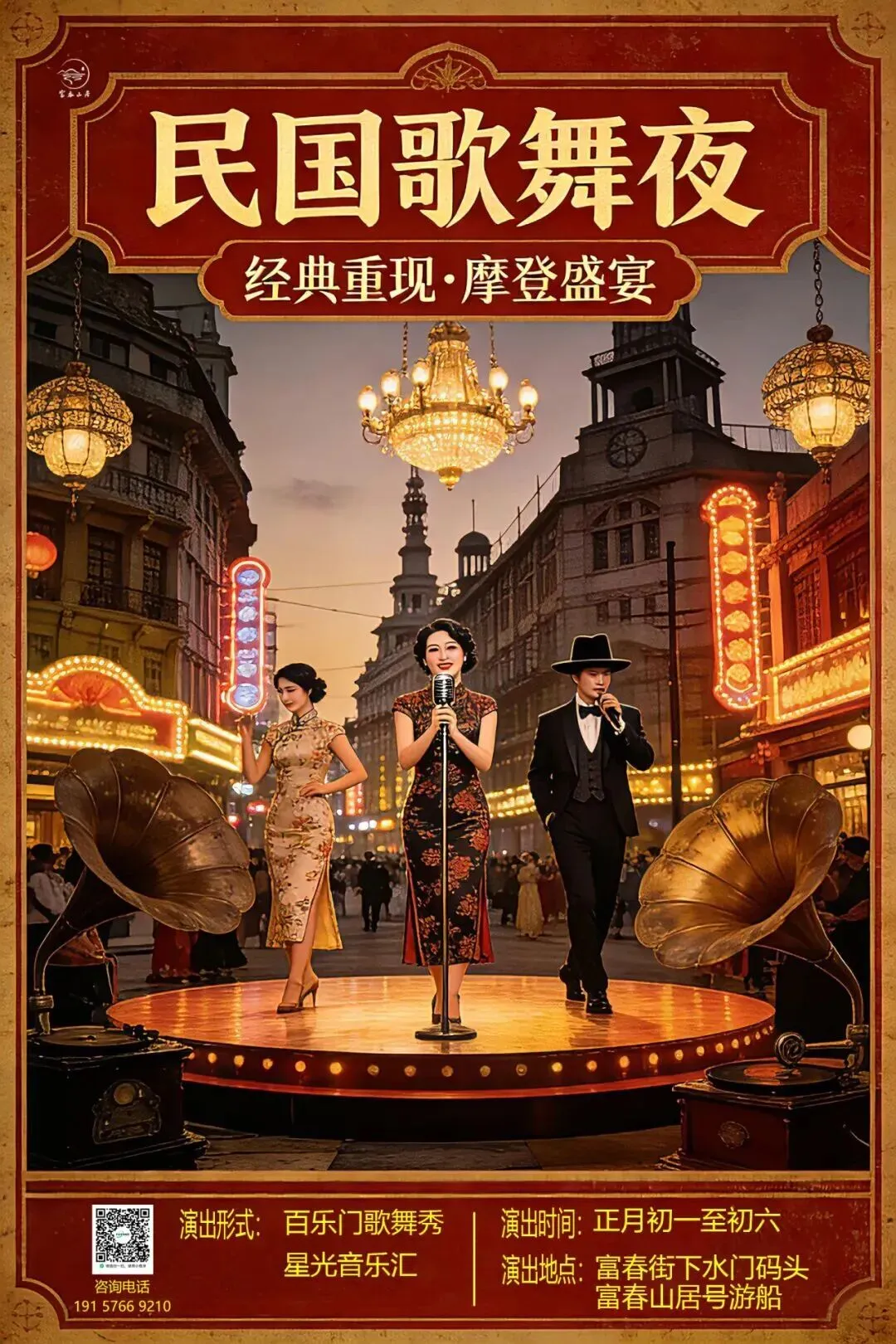 正月里的富春山居号,摇身一变成为流动的复古剧场,沉浸式歌舞巡演带你一秒坠入民国旧梦繁华。华灯初上时,江水如绸,灯光映着波光,旗袍倩影款款走来,歌声袅袅萦绕耳畔,这便是独属于富春的新春浪漫。
