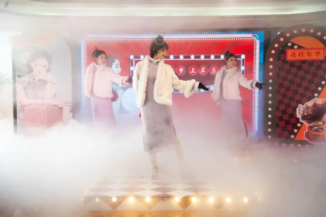 百乐门风情舞蹈翩然上演,羽毛扇轻摇,摇曳出一个时代的复古腔调,站在一旁打卡,仿佛穿越回老上海的繁华街巷。