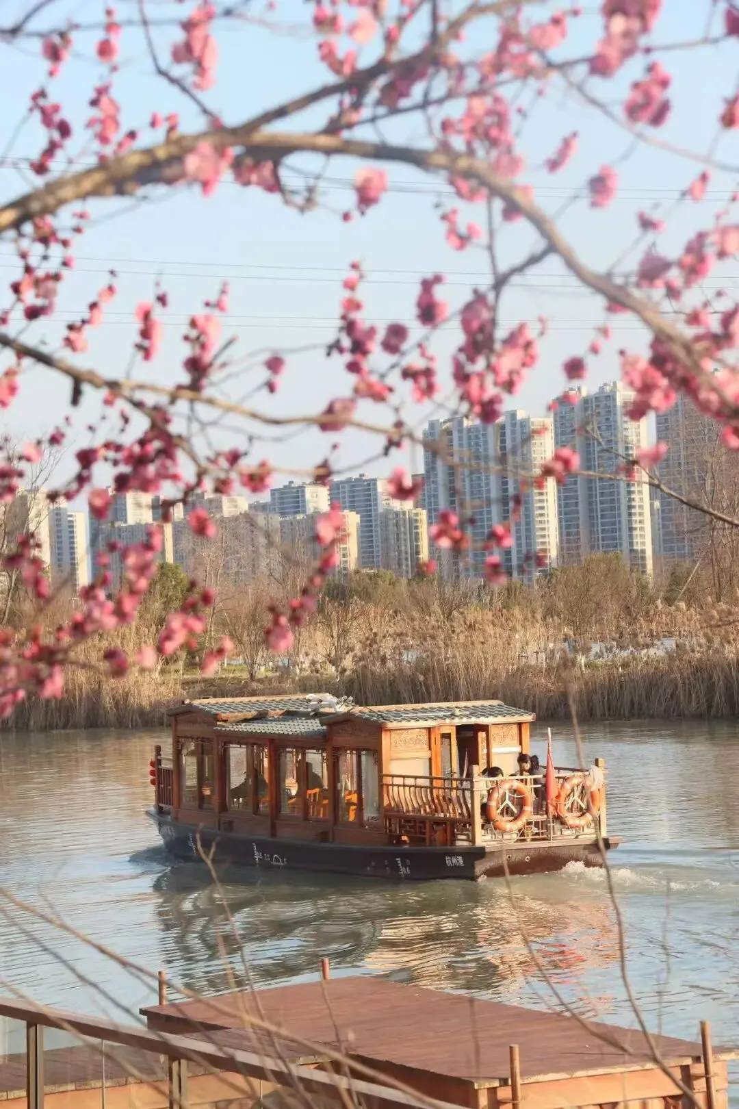 乘坐古韵画舫登梅花岛,解锁“舟行画中,人入梅海”的诗意浪漫,游船穿行湖湾,三面环水的梅花岛渐入眼帘,红梅似霞、白梅胜雪,粉梅点缀其间,构成流动的江南画卷,坐在画舫上拍梅花,古风大片轻松拿捏。