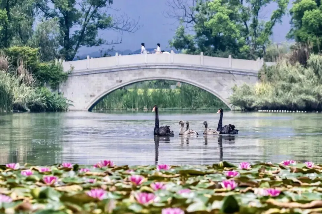 在南/北门乘坐观光车,或步行导航到“石米湾站”,穿过吊桥便能闯入梅林秘境,700余株梅树织就天然花廊,绿萼梅清丽、宫粉梅娇俏、红梅奔放,各有风姿,与水上赏梅相映成趣,站在梅林间,随手一拍都是古风氛围感大片。