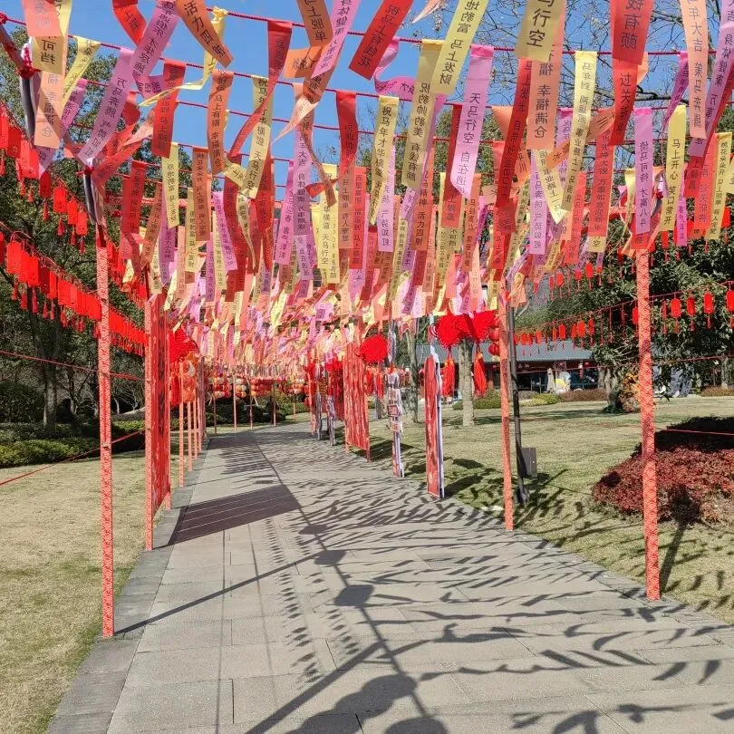 漫步于灯笼点缀的诗意步道,读诗句、系福带,写下新春心愿,在山水间许下新春第一愿,解锁一整年的好运气。