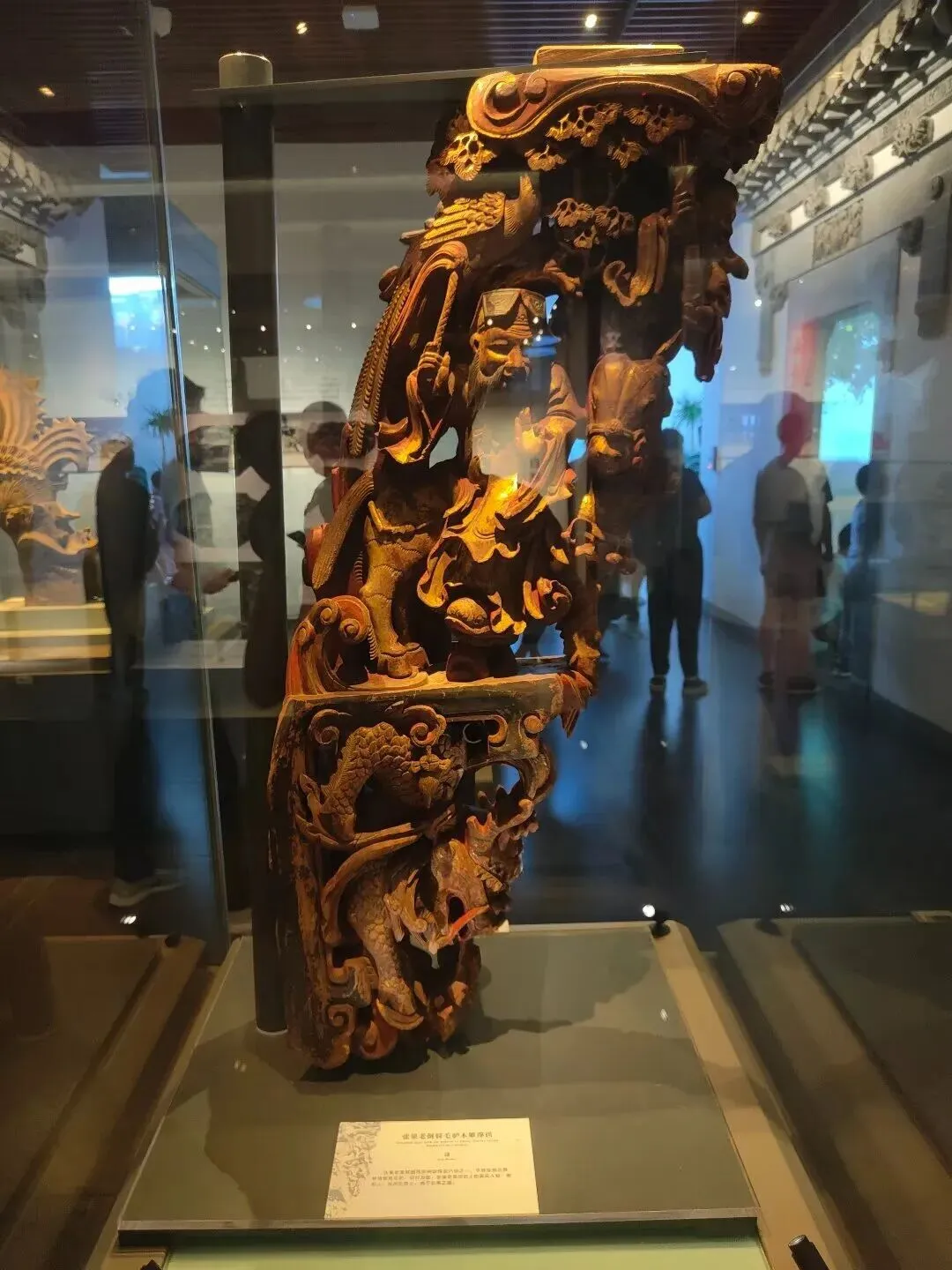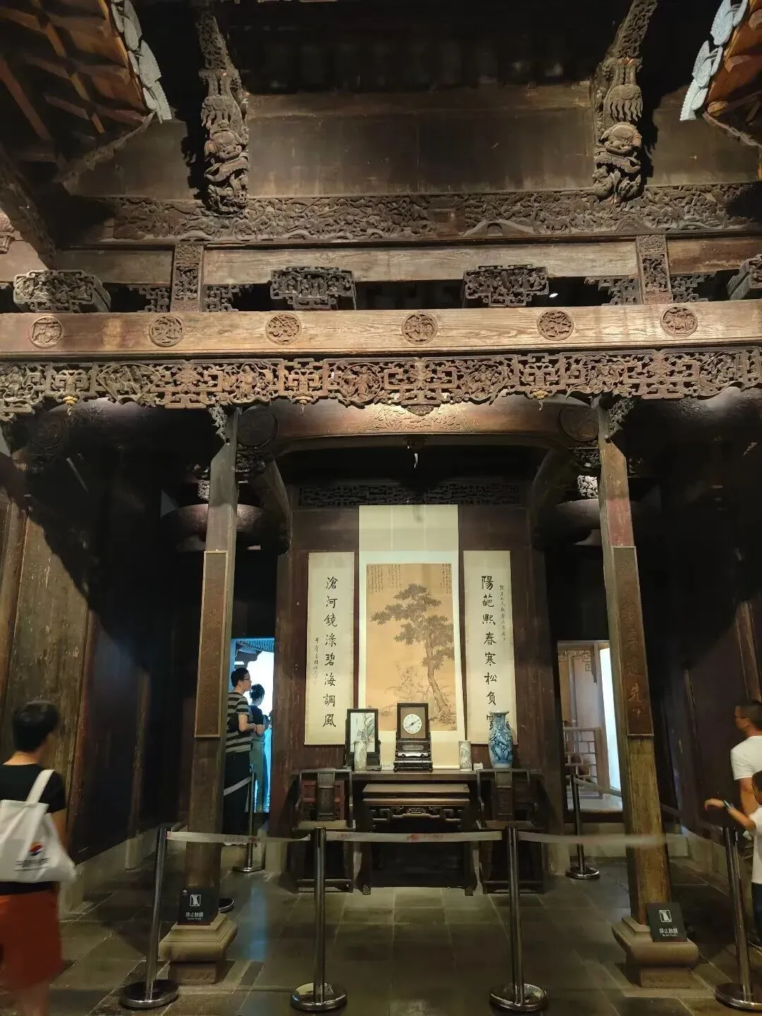 深入阐释了徽州古建筑作为中国民间建筑瑰宝的独特价值。展览通过历史沿革、文化渊源、自然环境的介绍,结合大量建筑构件、复原场景及图文,系统展示了徽州古建在聚落规划、空间布局、雕刻装饰等方面的特点,重点解读了民居、祠堂、牌坊这“古建三绝”所蕴含的“天人合一”理念、宗族伦理与精神追求。陈列中重点展示了“太子少保”匾、三国人物梁柁、百子图砖雕、游春图人物门罩砖雕、百里负米图砖雕、九世忠臣砖雕、梅竹君子人物撑栱等重要建筑构件,展现了徽州三雕的精湛技艺与丰富文化内涵。