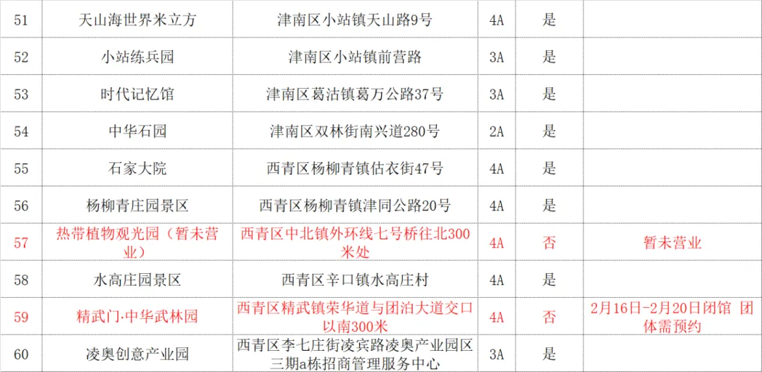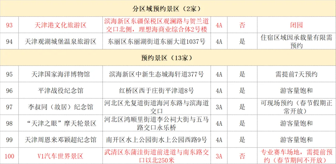 天津市A级旅游景区预约及开放情况表