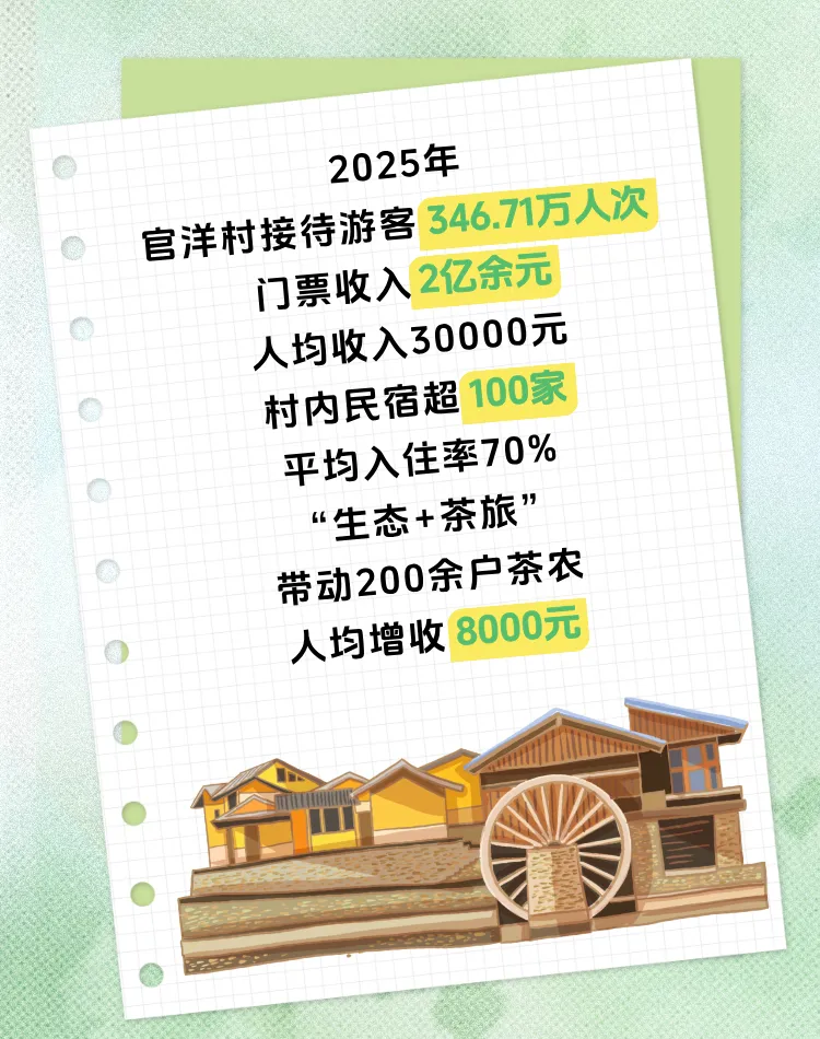 突出以旅游为桥,铺就生态经济双赢富裕路。官洋累计整合资金2亿元,通过清淤疏浚、河道拓宽等系统治理,有效提升水质,两岸植被覆盖率达85%,依托优越的自然资源,通过生态价值转化旅游价值,溪水铺就绿水青山变金山银山的富民路。旅游发展带动住宿、餐饮、艺术创作、生态农业等产业协同发展,吸引众多青年返乡创业,带领村民走上共同致富之路。2025年,官洋村接待游客346.71万人次,门票收入2亿余元。村内民宿超100家,平均入住率70%,“生态+茶旅”带动200余户茶农人均增收8000元,官洋村人均收入从2008年的10000元增至2025年的30000元。
