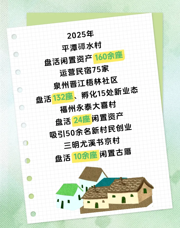 在闲置资产盘活领域,三明尤溪书京村盘活10余座闲置古厝,探索一条“以文化激活乡村空间、以艺术内容留住人群、以生活方式实现长期运营”的乡村旅游发展路径,创新“100个美愈计划”系列课程,用艺术点亮乡村振兴;平潭综合实验区磹水村盘活闲置资产160余座,全村已运营75家民宿,2025年接待游客量超30万人次;泉州晋江梧林社区2025年新增引进11家商户,2025年接待游客量超213万人次,完成“闲置资源变增收资产”的美丽蝶变。