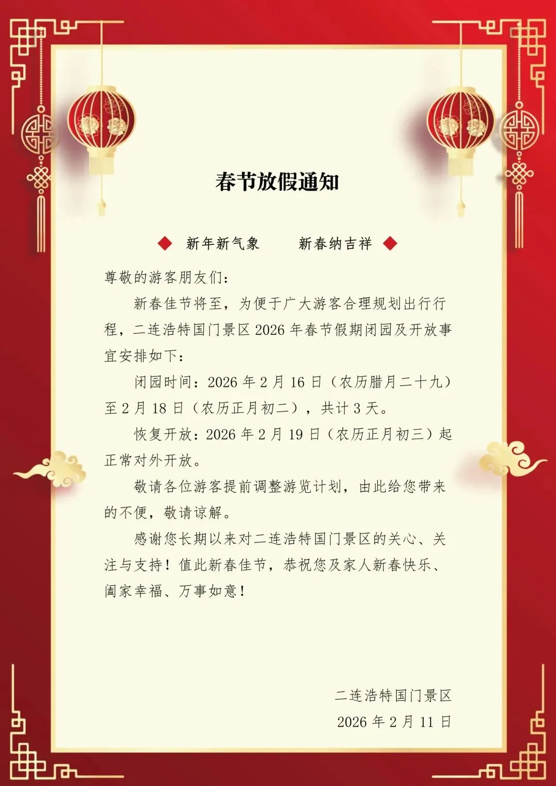 您现在的位置是:首页 > 国内旅游目的推荐 > 正文 国内旅游目的推荐 通知 | 国门景区春节假期开放时间安排 admin2026年02月11日 21:15:06国内旅游目的推荐9 通知 | 国门景区春节假期开放时间安排主办|二连浩特市融媒体中心终审|袁瑞冬审核|吕 静 王晓晖编辑|张亚彤来源|伊林太阳花微信公众号声明:转载请注明来源于“活力二连”微信公众号点击下方“活力二连”,关注我们求点赞求分享求喜欢公益广告 已关注 关注 重播 分享 赞 视频详情 二连浩特市科学技术协会 已关注 关注 重播 分享 赞 视频详情 二连浩特市福利彩票销售服务中心 已关注 关注 重播 分享 赞 视频详情 二连浩特市红十字会 转载请说明来源于"旅荐网",部分内容转载自网络,如有侵权请联系qlwl@foxmail.com删除 本文地址:https://www.15386.cn/post/102264.html 上一篇 当雄县文旅局开展纳木措景区整改复查暨节前安全生产专项检查 下一篇 南京兼职|秦淮区景区引导员兼职,120 元 / 天,男女不限 相关文章 周末周边行,央视热播剧取景!老友记们的游玩攻略来了! 《“十五五”文化和旅游发展规划》四大编制使命 新能源车出游指南:老司机的10个实用建议 腾冲四季旅行攻略:本地人带你玩转极边第一城 2026年春节去大理旅游地图路线攻略看过来 山西晋城五天四晚小众路线旅游攻略 旅行攻略 | 赴一场春日的幸运之约(文末含兑换码) 腾冲四季旅行攻略:本地人带你玩转极边第一城 3-5\7️福建旅游攻略已做好!姐妹们码住 越南清化省海进海滩超详细旅行攻略 发表评论 取消回复 评论列表 这篇文章还没有收到评论,赶紧来抢沙发吧~