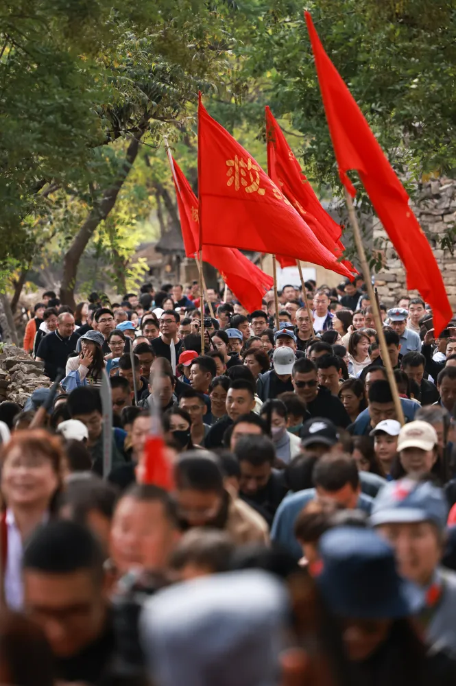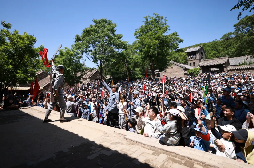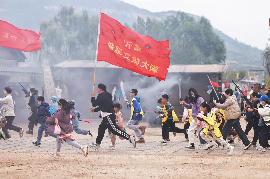《重走支前路》是红嫂家乡旅游区2024年国庆节推出的大型行进式文体旅融合项目,游客通过穿越古村行军、向古县城冲锋、胜利后跳欢庆舞蹈、扭秧歌庆祝等环节,在红色文化体验中强健了身体,节目推出后,迅速火爆全网。