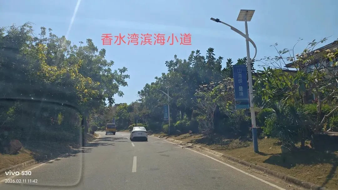 11点离开日月湾礼堂,在海南环岛高速入口,进入高速红角岭互通道下,进入香水湾大道。11.30进入陵水地区,在海南环岛旅游公路行驶,转入小道去香水湾滨海公路网红点