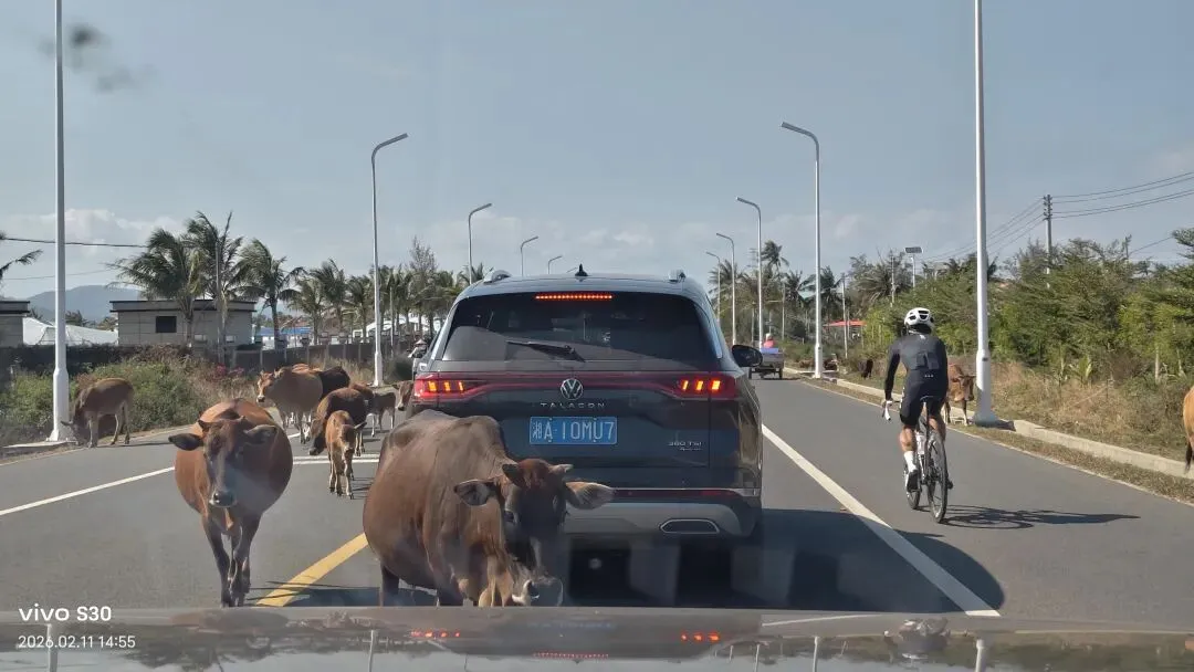 很巧的碰到一群牛,汽车等着慢慢走过。