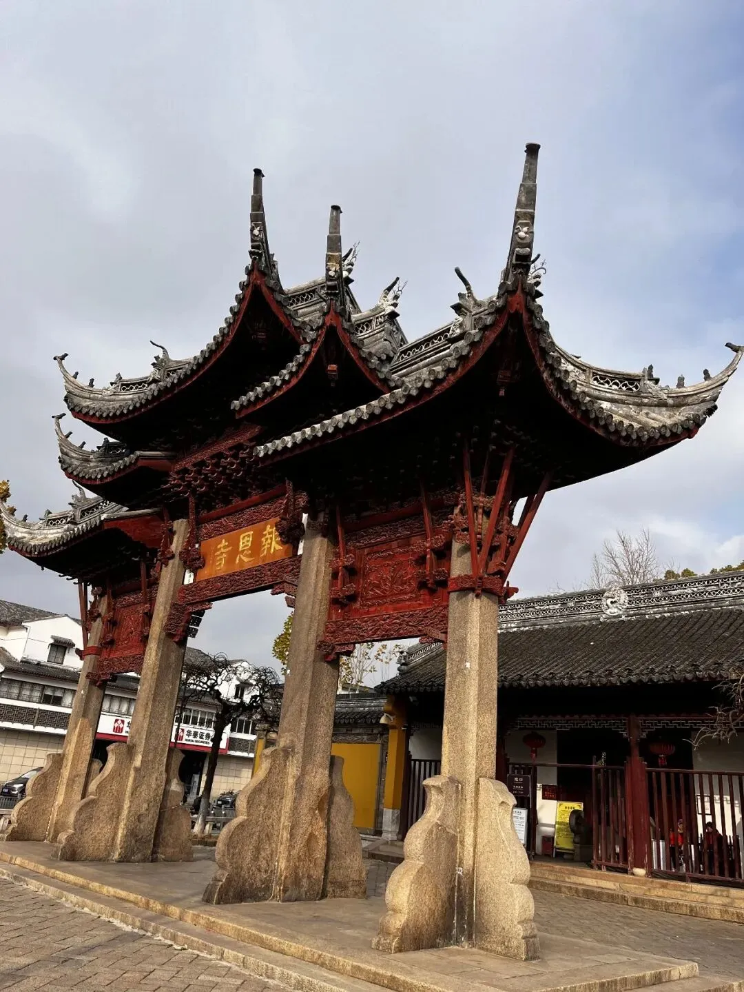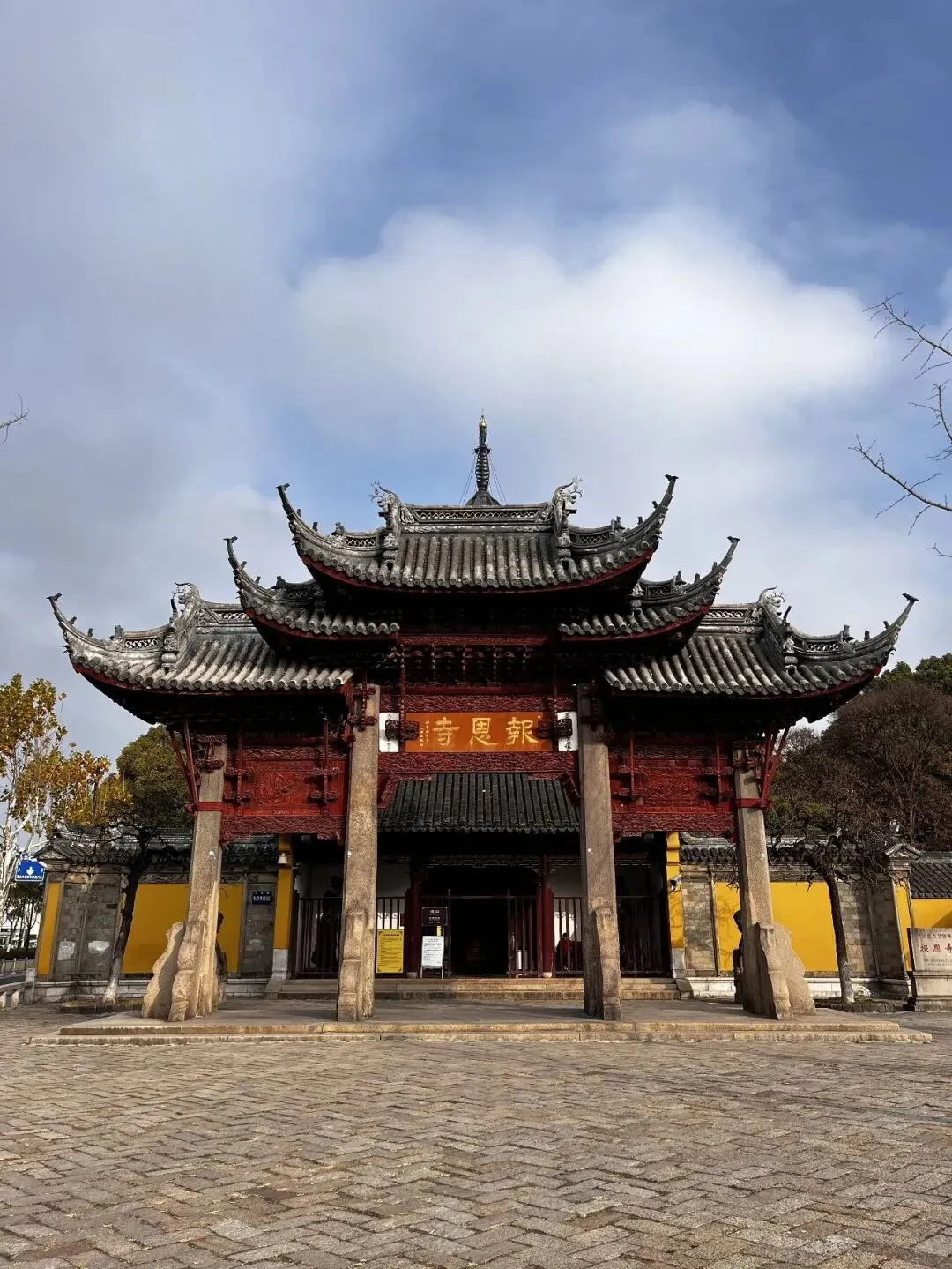 苏州报恩寺又名北寺,免费入园,始建于三国东吴赤乌年间,是东吴大帝孙权为报母恩而建,初名通玄寺,是苏州现存历史最悠久的佛寺,距今1700余年。寺前牌坊、山门秀丽气派,门前一对石狮骨骼清奇,俏皮可爱。这牌坊和山门,建于明万历四十五年,均为1979年移自马医科申时行祠,牌坊上的木雕、山门上的砖雕都至为复杂。牌坊原为申时行祠堂前的“忠良柱石”坊,是苏州城内唯一保存完整的大型明代石柱木构牌坊;山门青石八字墙照壁及须弥座上的方胜纹等砖雕纹饰,具有典型的明代特征。
