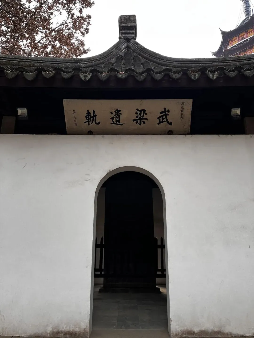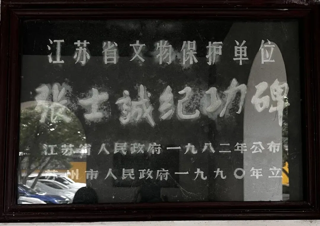 殿西有一白色亭子,上写“武梁遗轨”四字,亭中的石碑,就是元代的“张士诚纪功碑”。