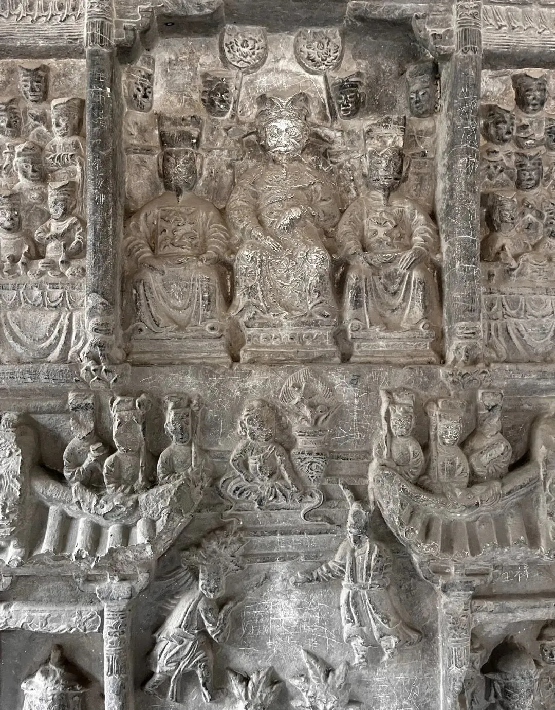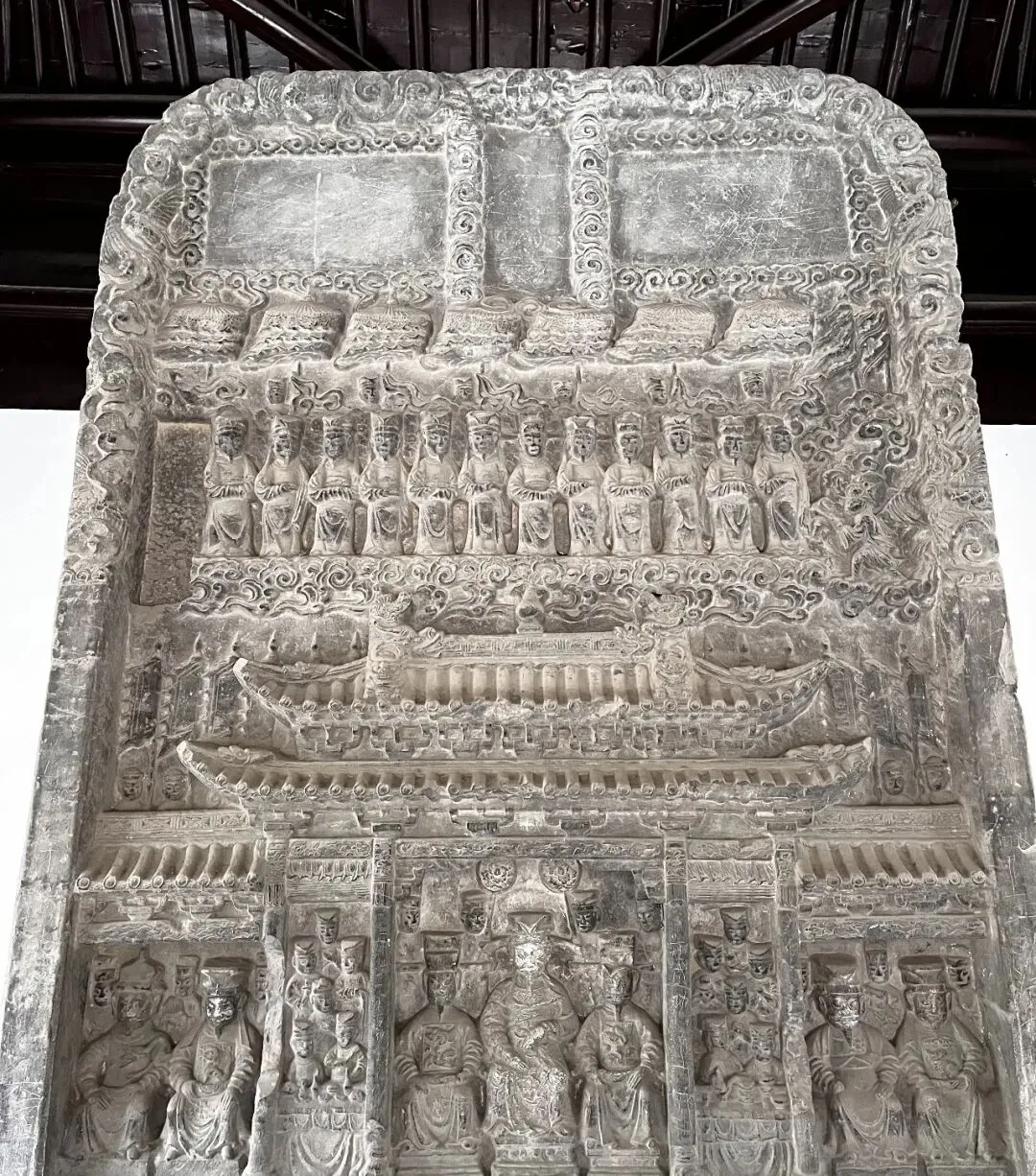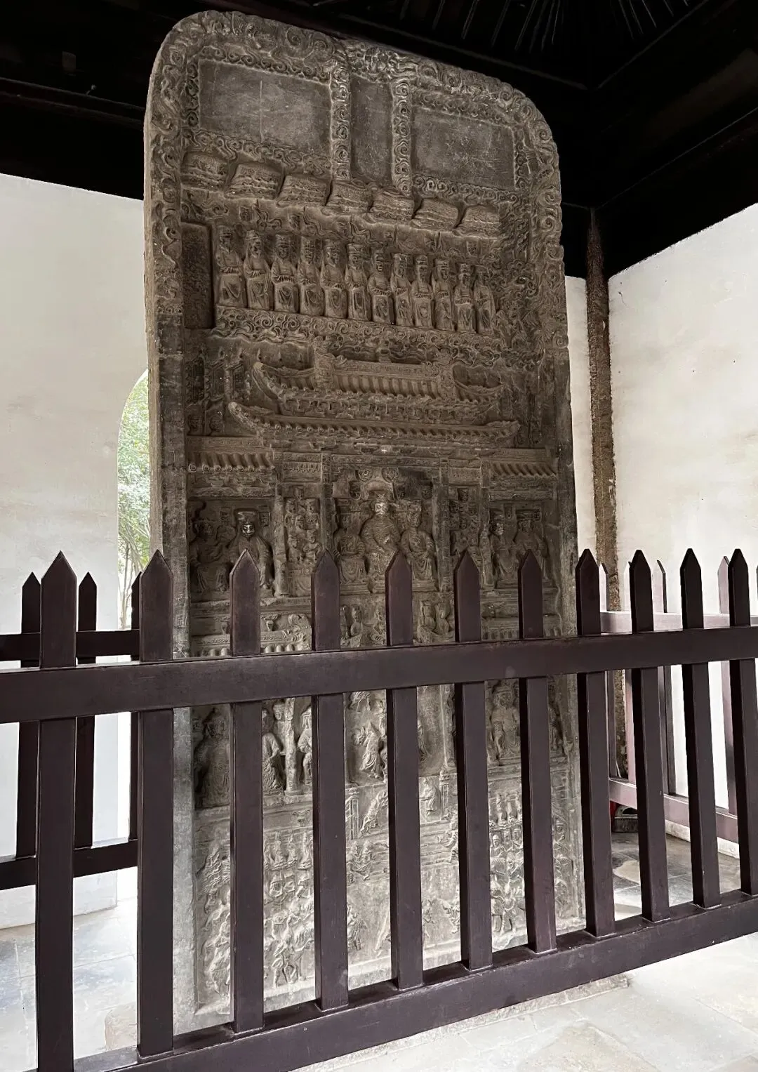 此碑原称隆午造像石刻,是极罕见的元代纪事石雕作品。高3米多,宽1米多。内容是张士诚设宴款待元使伯颜的礼仪场面。张士诚是江苏泰州白驹场人,元未义军首领。元至正十三年(1353)率盐丁起义,反对元朝统治,至正十六年,义年攻占平江(苏州)后,张士诚追求安乐享受,逐渐由反元变为降元。至正二十七年,明初朱元璋的大军攻破平江城,张士诚被擒,后自缢而亡。据记载,张士诚纪功碑为元未江南富豪沈万三为歌颂张士诚“政绩”而置。该碑采用高浮雕手法,琢工精细,风格与山东东汉武梁祠画像石接近,浑朴、雄建,故亭上有“武梁遗轨”之匾额。