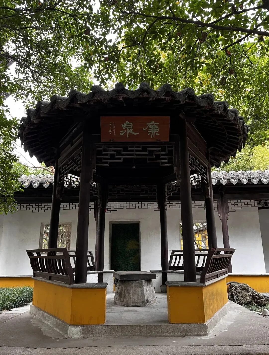 准备离开时,看到一个“廉泉”亭,内置一口小巧的水井,井栏上有不怎么看得清的文字和一个类似帽子样的图案,