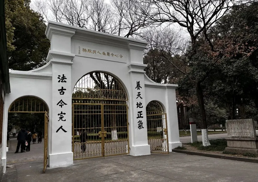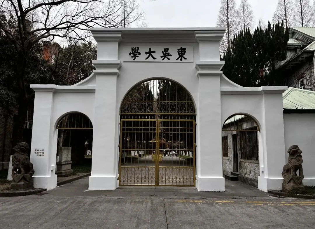 红楼往南即东吴大学老校门,老校门坐南朝北,始建于20世纪初,为巴洛克风格。“东吴大学”校名由清朝帝师、常熟人翁同龢题写。校门内侧中文校训“养天地正气,法古今完人”,由首任中国籍校长杨永清先生提出,并于1935年加刻于两侧门柱之上。
