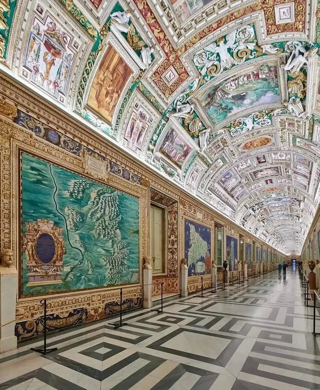 地图廊: 一个长达 120 米的走廊,天花板金碧辉煌,墙上绘制着 16 世纪意大利各地的地图。走在里面,就像穿梭在一条金色的时光隧道。